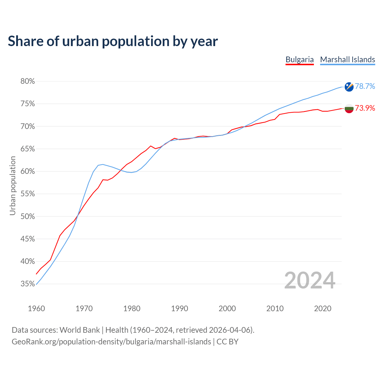 From 2004 to 2024, the share of urban population changed from 69.9% to 73.9% in Bulgaria and from 70.1% to 78.7% in the Marshall Islands.