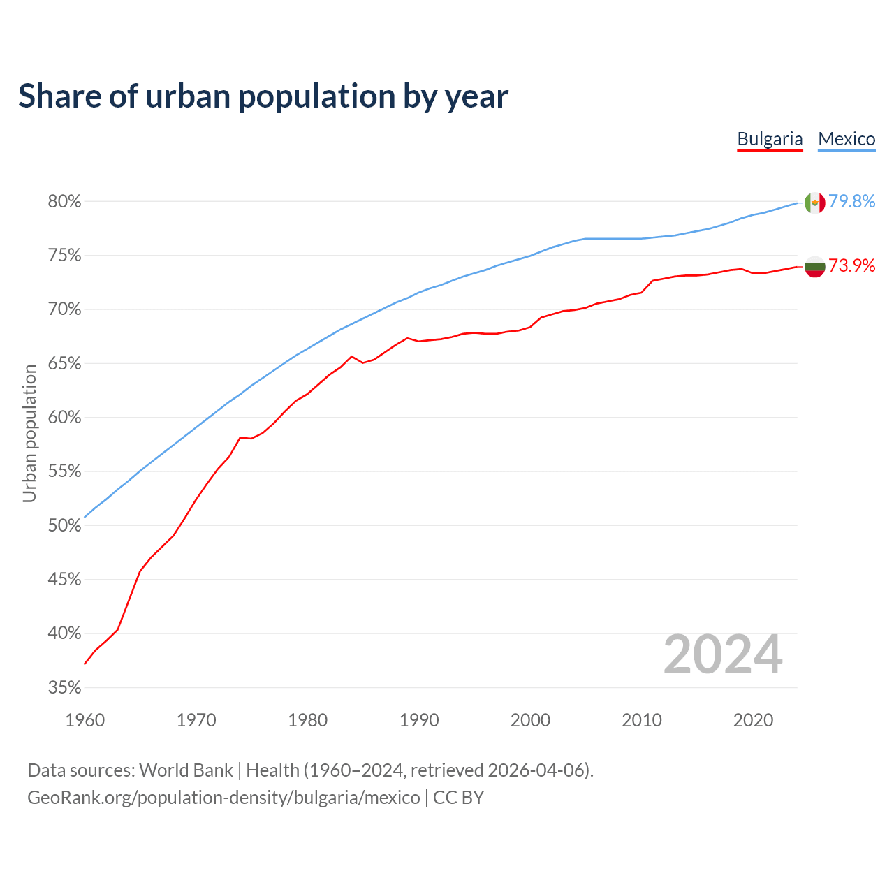 From 2004 to 2024, the share of urban population changed from 69.9% to 73.9% in Bulgaria and from 76.3% to 79.8% in Mexico.