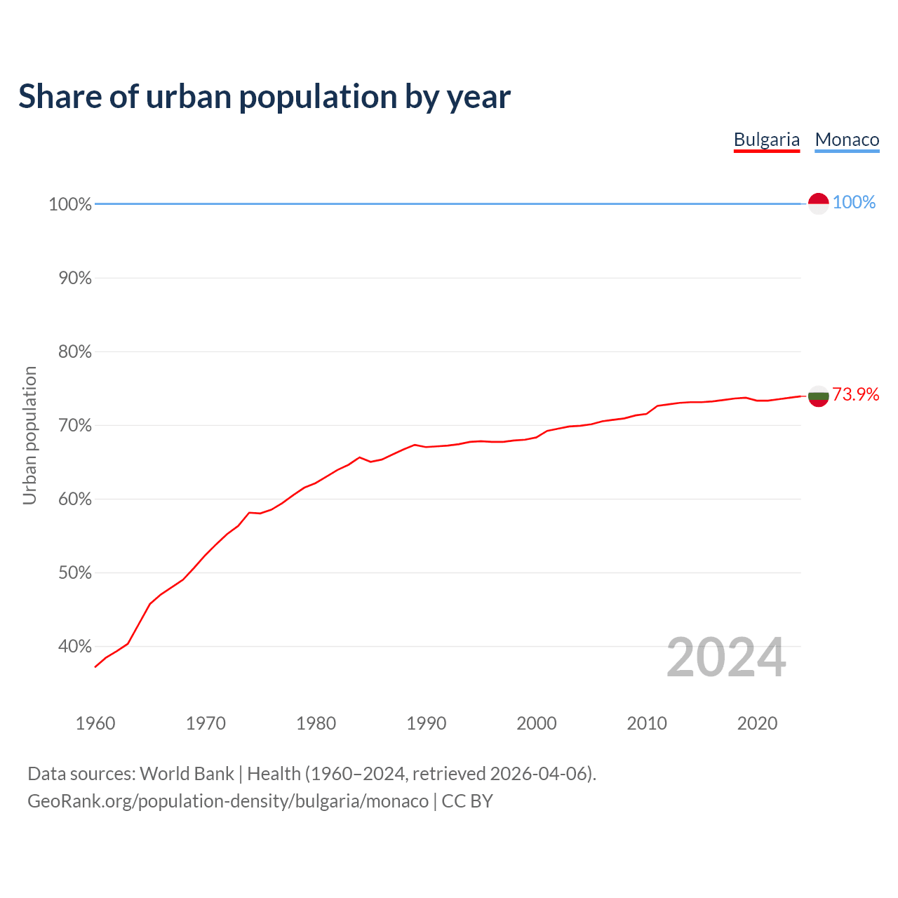 From 2004 to 2024, the share of urban population changed from 69.9% to 73.9% in Bulgaria and from 100% to 100% in Monaco.