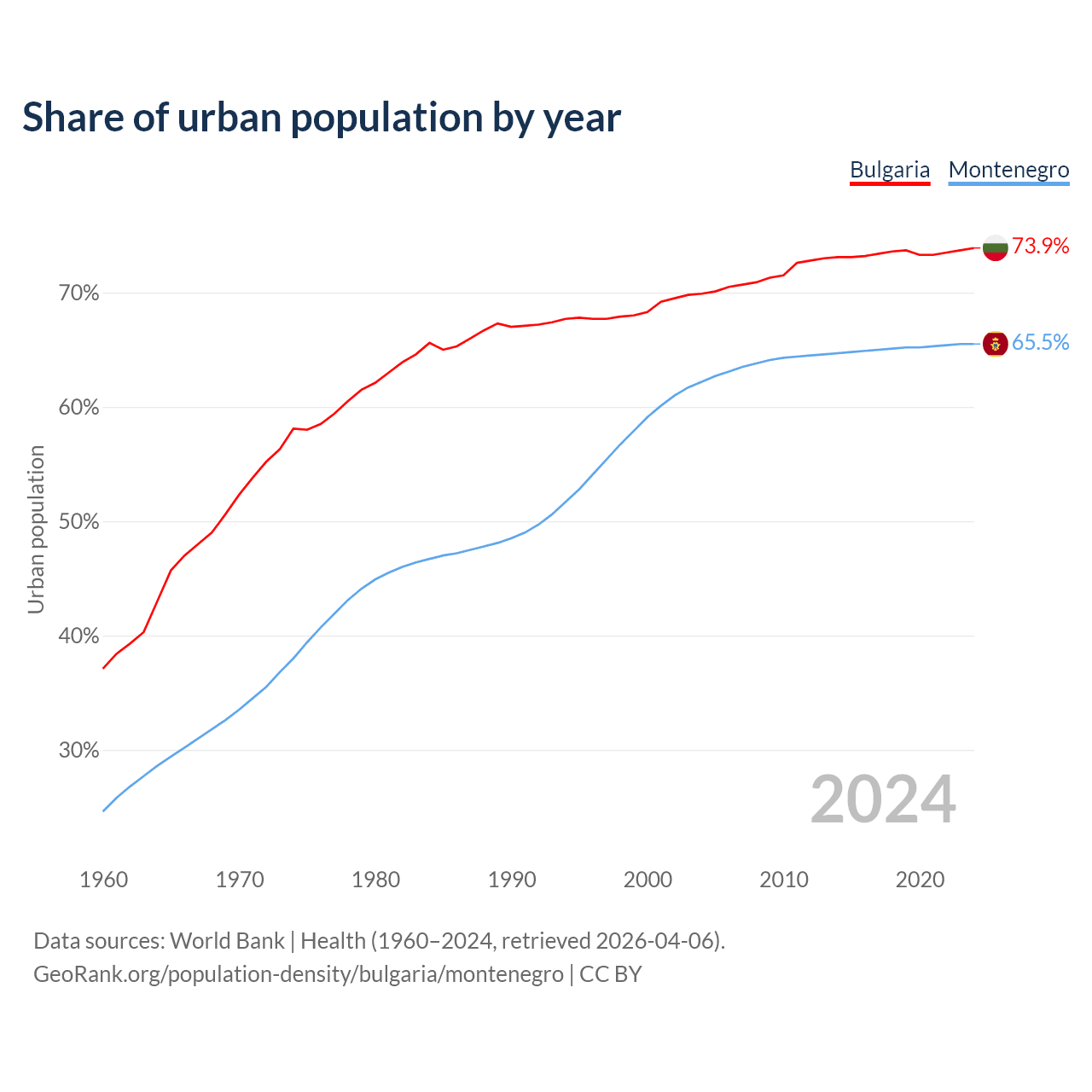 From 2004 to 2024, the share of urban population changed from 69.9% to 73.9% in Bulgaria and from 62.2% to 65.5% in Montenegro.