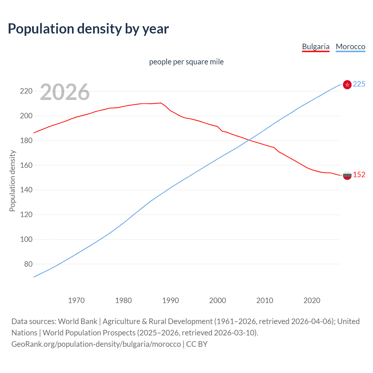 From 2006 to 2026, population density in Bulgaria decreased by 16.3%, compared to a 26% growth in Morocco.
