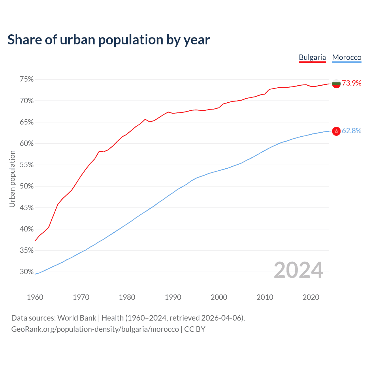 From 2004 to 2024, the share of urban population changed from 69.9% to 73.9% in Bulgaria and from 55% to 62.8% in Morocco.