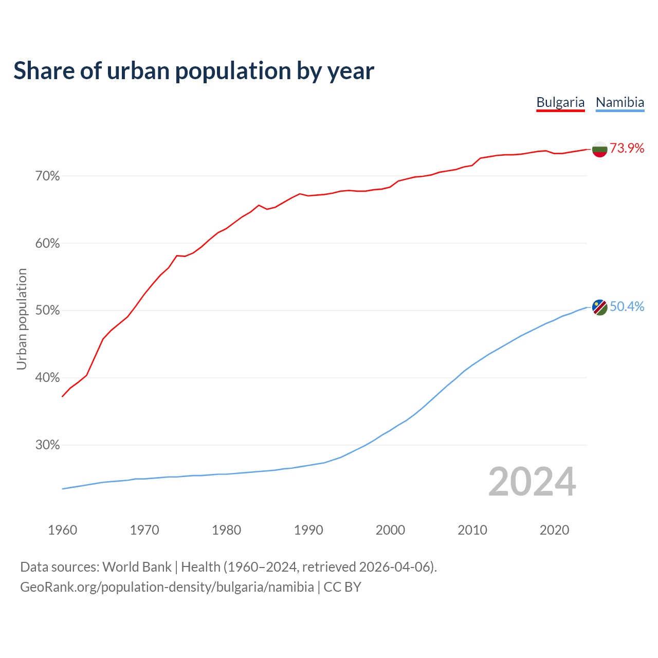 From 2004 to 2024, the share of urban population changed from 69.9% to 73.9% in Bulgaria and from 35.5% to 50.4% in Namibia.