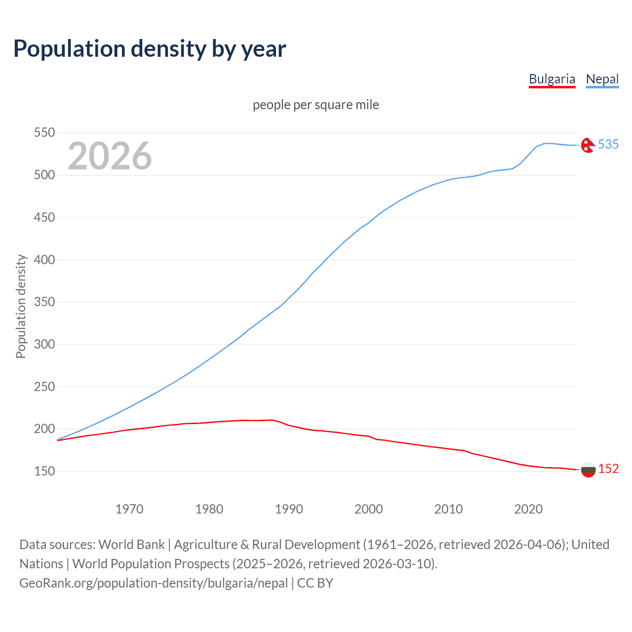 From 2006 to 2026, population density in Bulgaria decreased by 16.3%, compared to a 11.4% growth in Nepal.