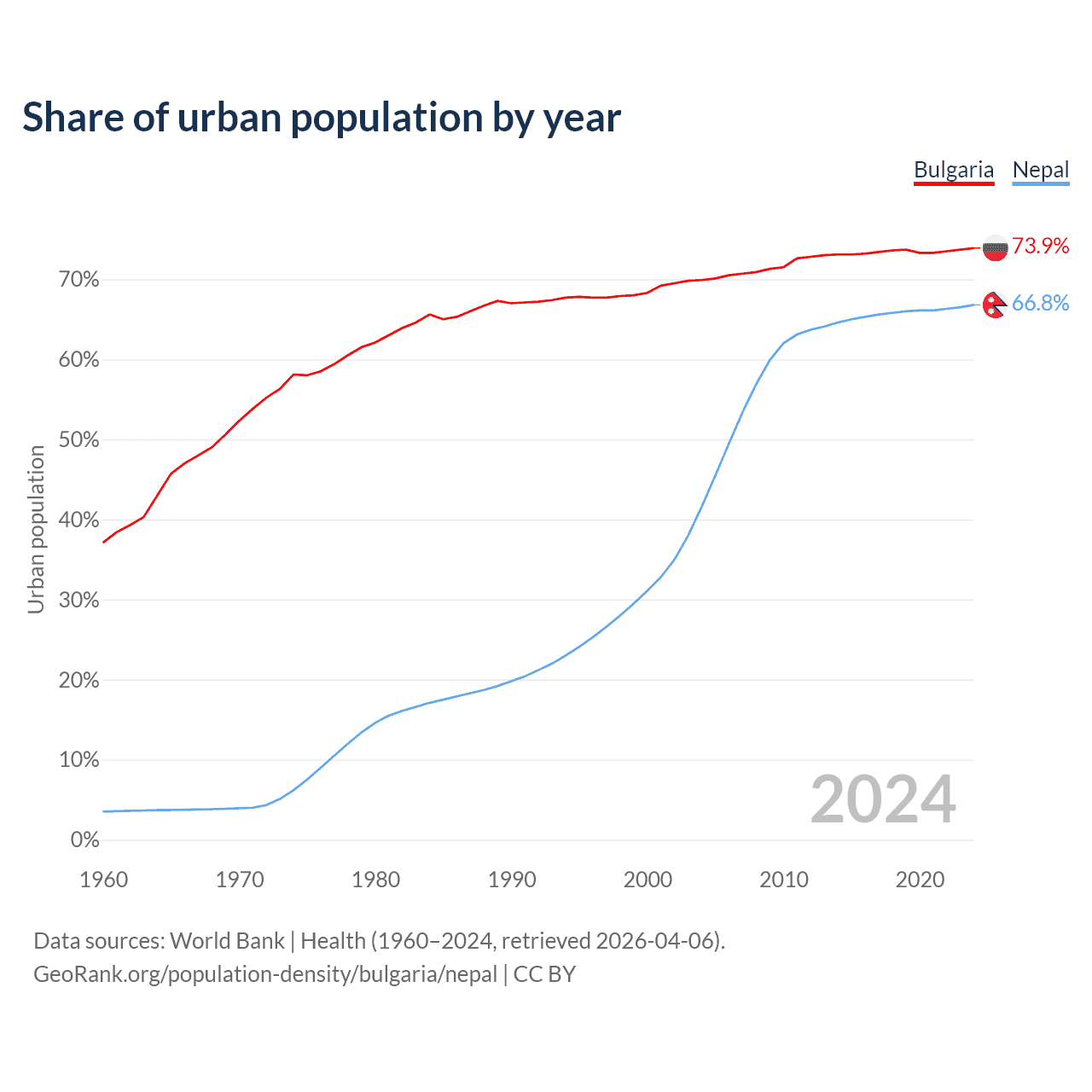 From 2004 to 2024, the share of urban population changed from 69.9% to 73.9% in Bulgaria and from 41.6% to 66.8% in Nepal.