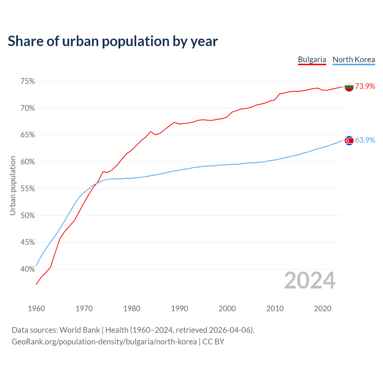 From 2004 to 2024, the share of urban population changed from 69.9% to 73.9% in Bulgaria and from 59.7% to 63.9% in North Korea.