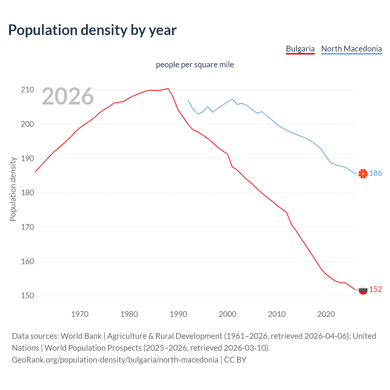 From 2006 to 2026, population density in Bulgaria decreased by 16.3%, compared to a 8.69% decline in North Macedonia.