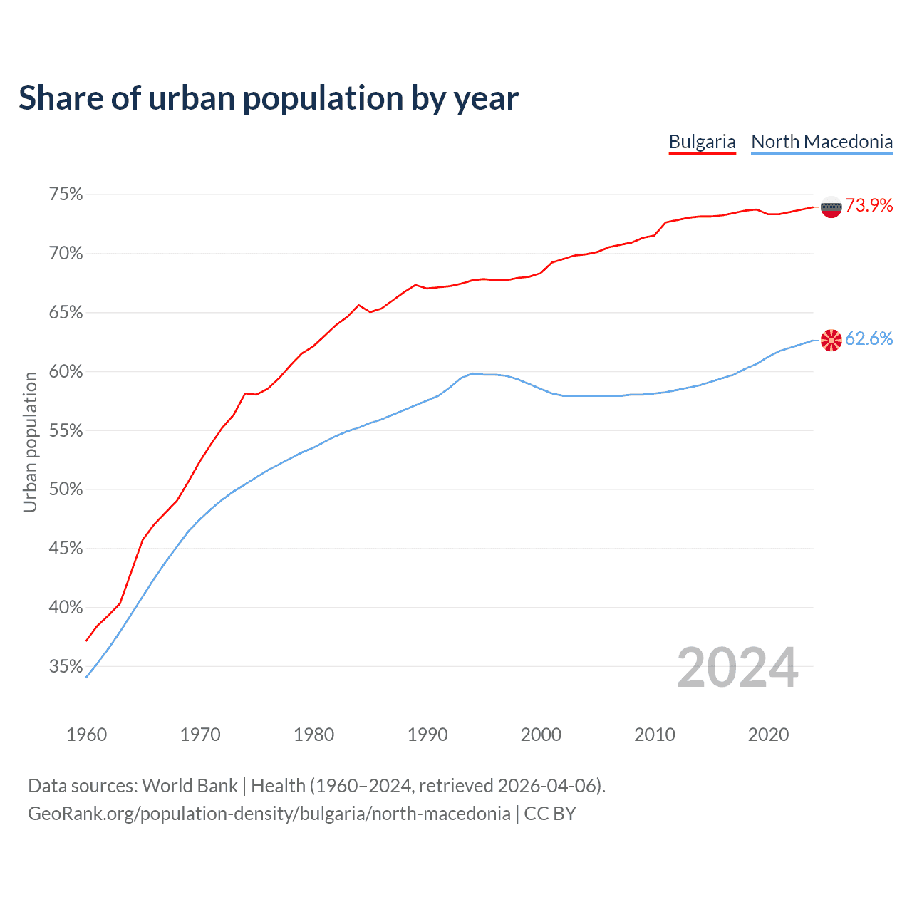 From 2004 to 2024, the share of urban population changed from 69.9% to 73.9% in Bulgaria and from 57.9% to 62.6% in North Macedonia.