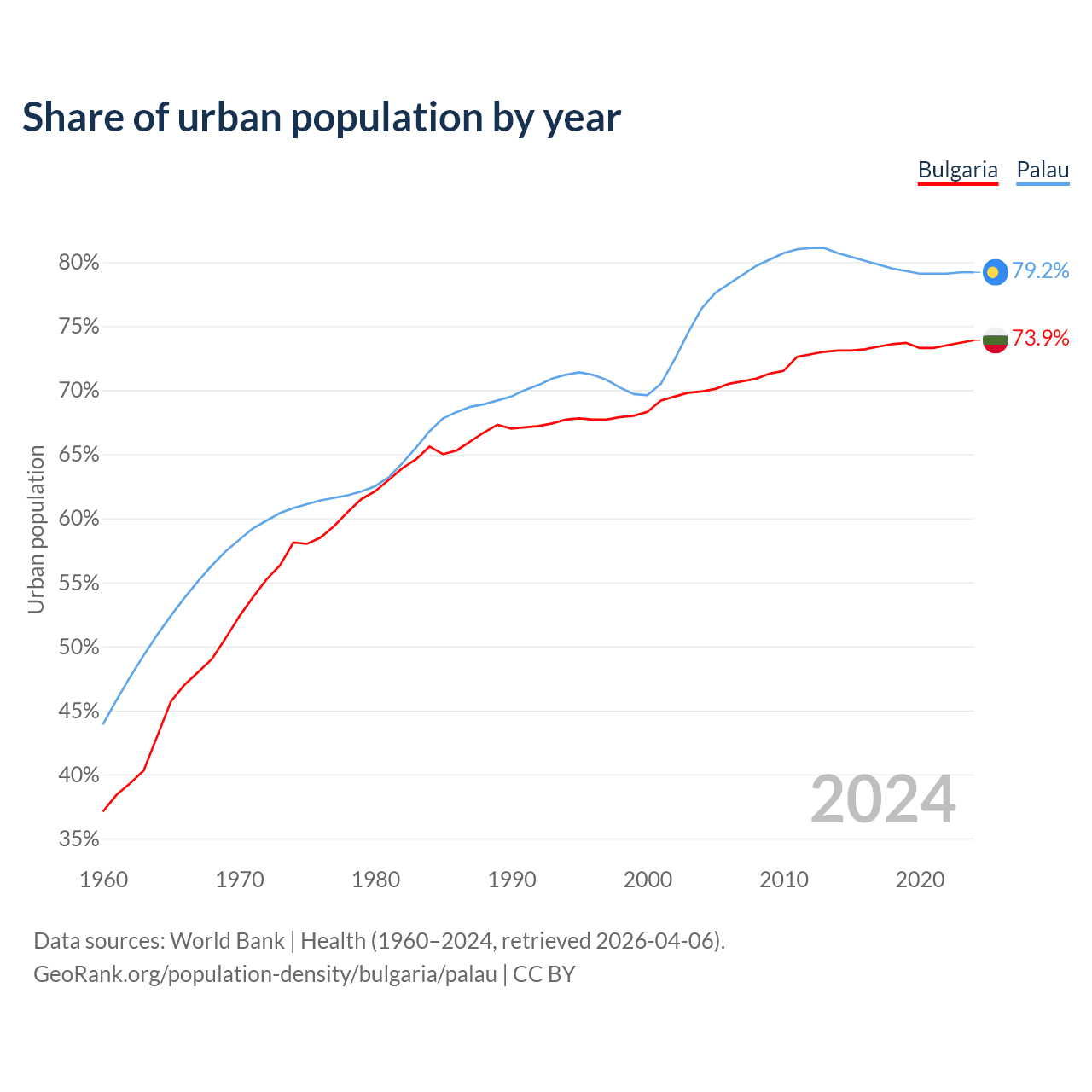 From 2004 to 2024, the share of urban population changed from 69.9% to 73.9% in Bulgaria and from 76.4% to 79.2% in Palau.
