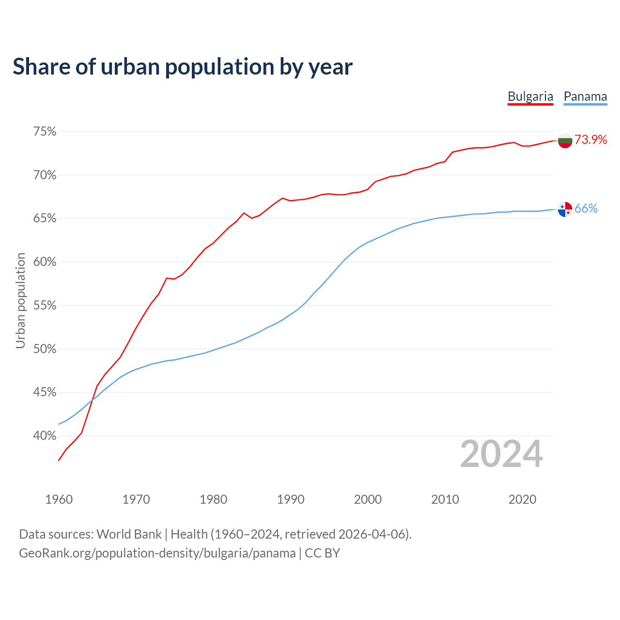 From 2004 to 2024, the share of urban population changed from 69.9% to 73.9% in Bulgaria and from 63.8% to 66% in Panama.