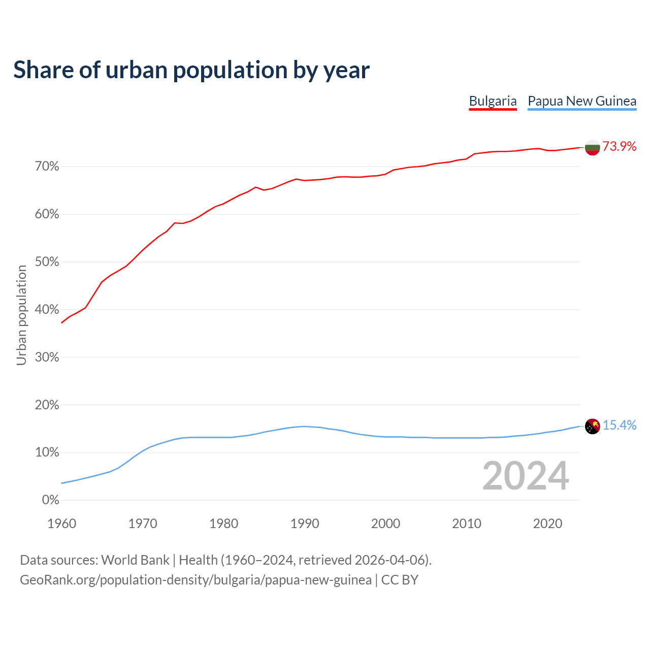 From 2004 to 2024, the share of urban population changed from 69.9% to 73.9% in Bulgaria and from 13.1% to 15.4% in Papua New Guinea.