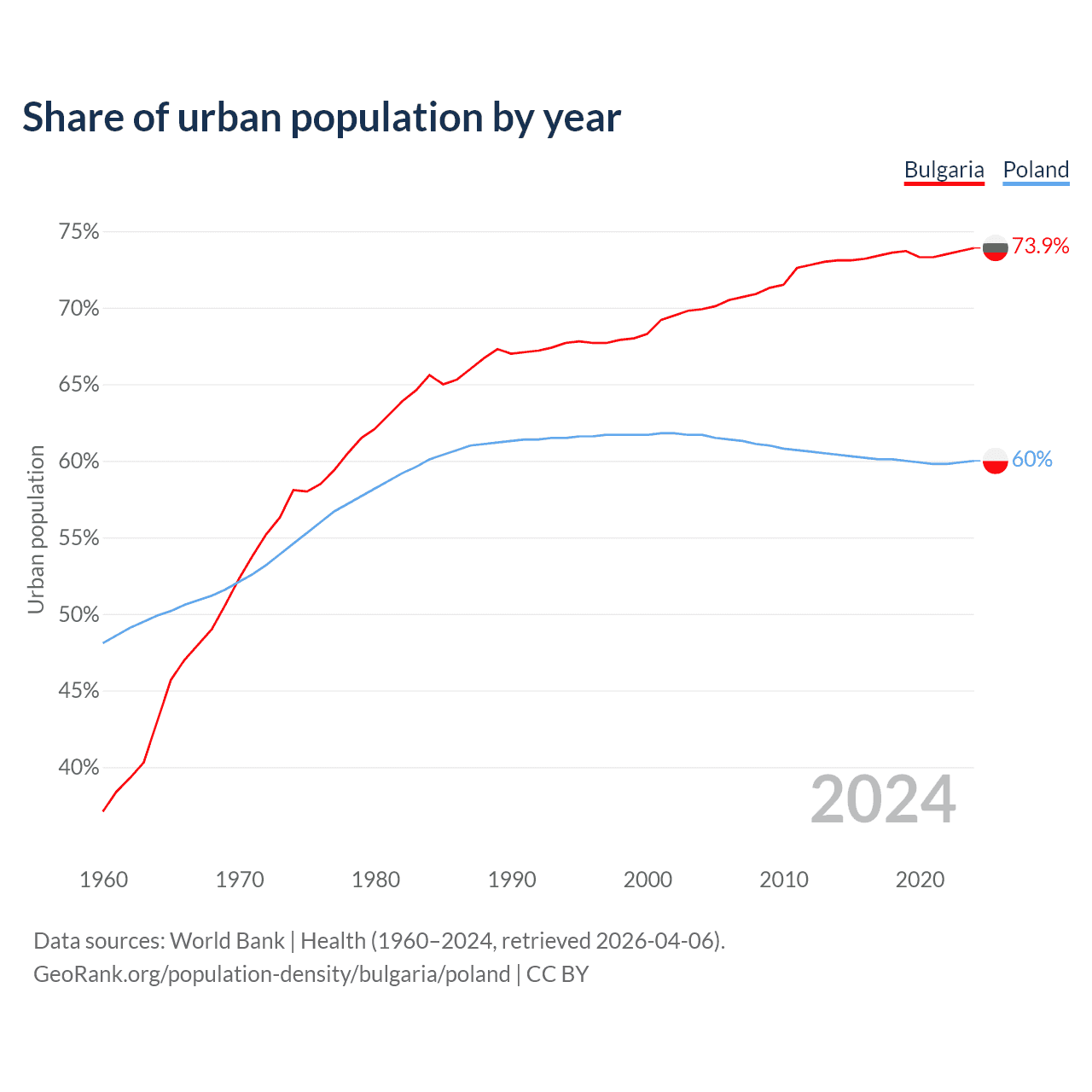 From 2004 to 2024, the share of urban population changed from 69.9% to 73.9% in Bulgaria and from 61.7% to 60% in Poland.