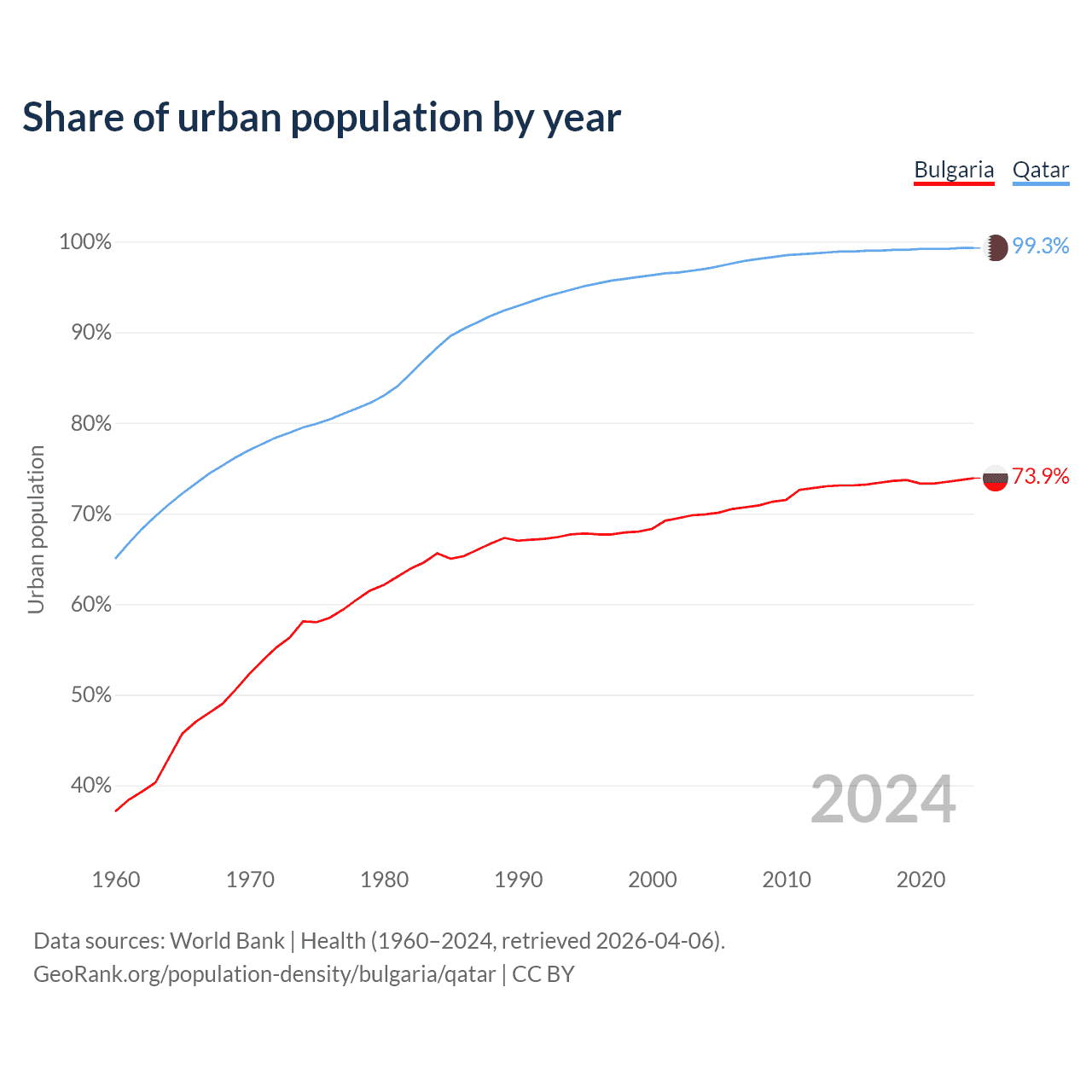 From 2004 to 2024, the share of urban population changed from 69.9% to 73.9% in Bulgaria and from 97% to 99.3% in Qatar.