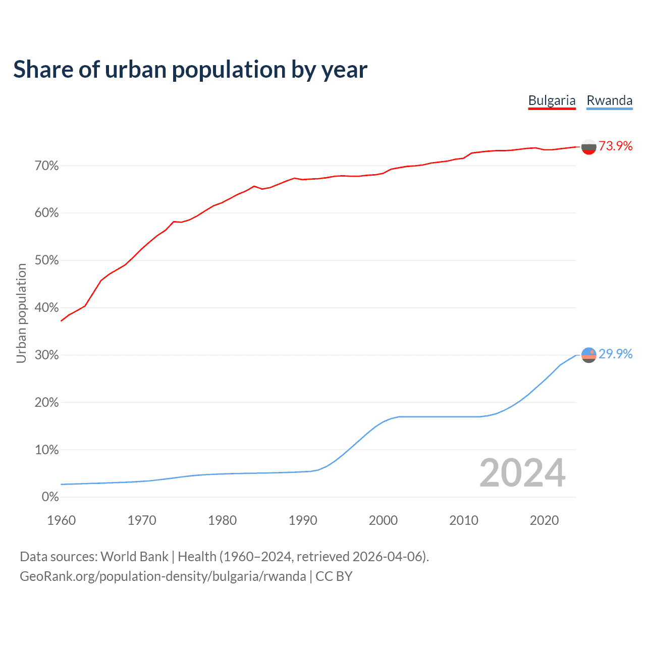 From 2004 to 2024, the share of urban population changed from 69.9% to 73.9% in Bulgaria and from 16.9% to 29.9% in Rwanda.