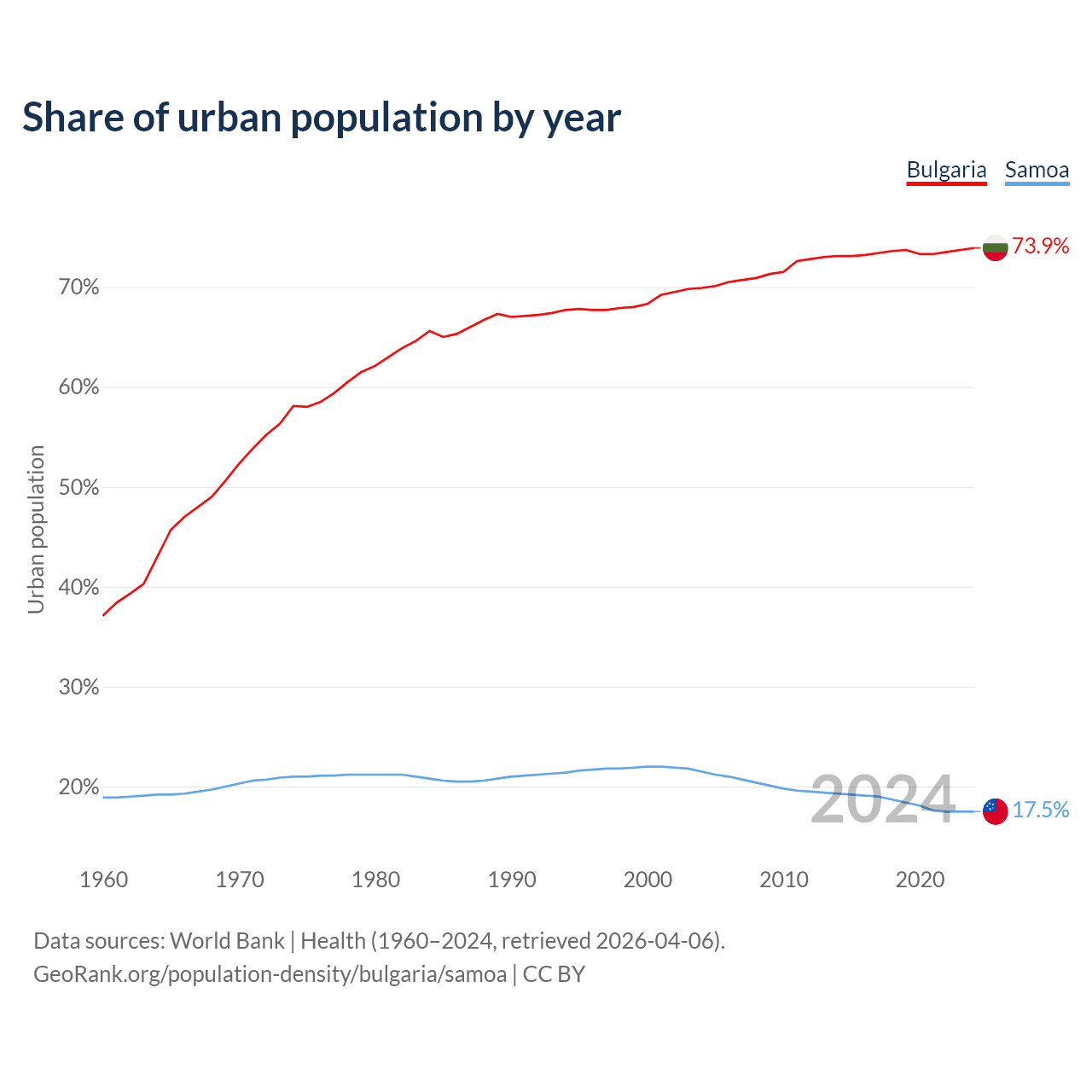 From 2004 to 2024, the share of urban population changed from 69.9% to 73.9% in Bulgaria and from 21.5% to 17.5% in Samoa.