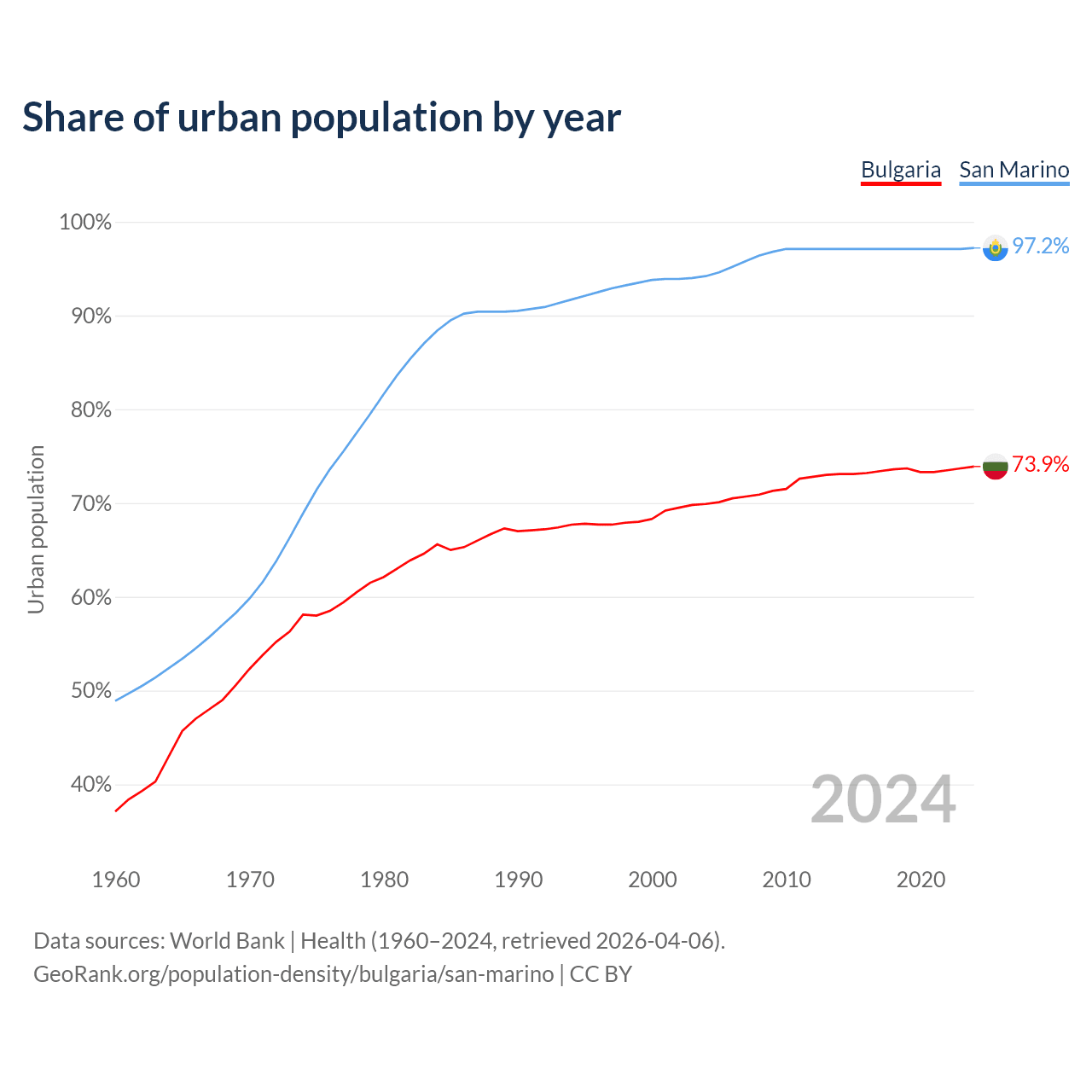 From 2004 to 2024, the share of urban population changed from 69.9% to 73.9% in Bulgaria and from 94.2% to 97.2% in San Marino.