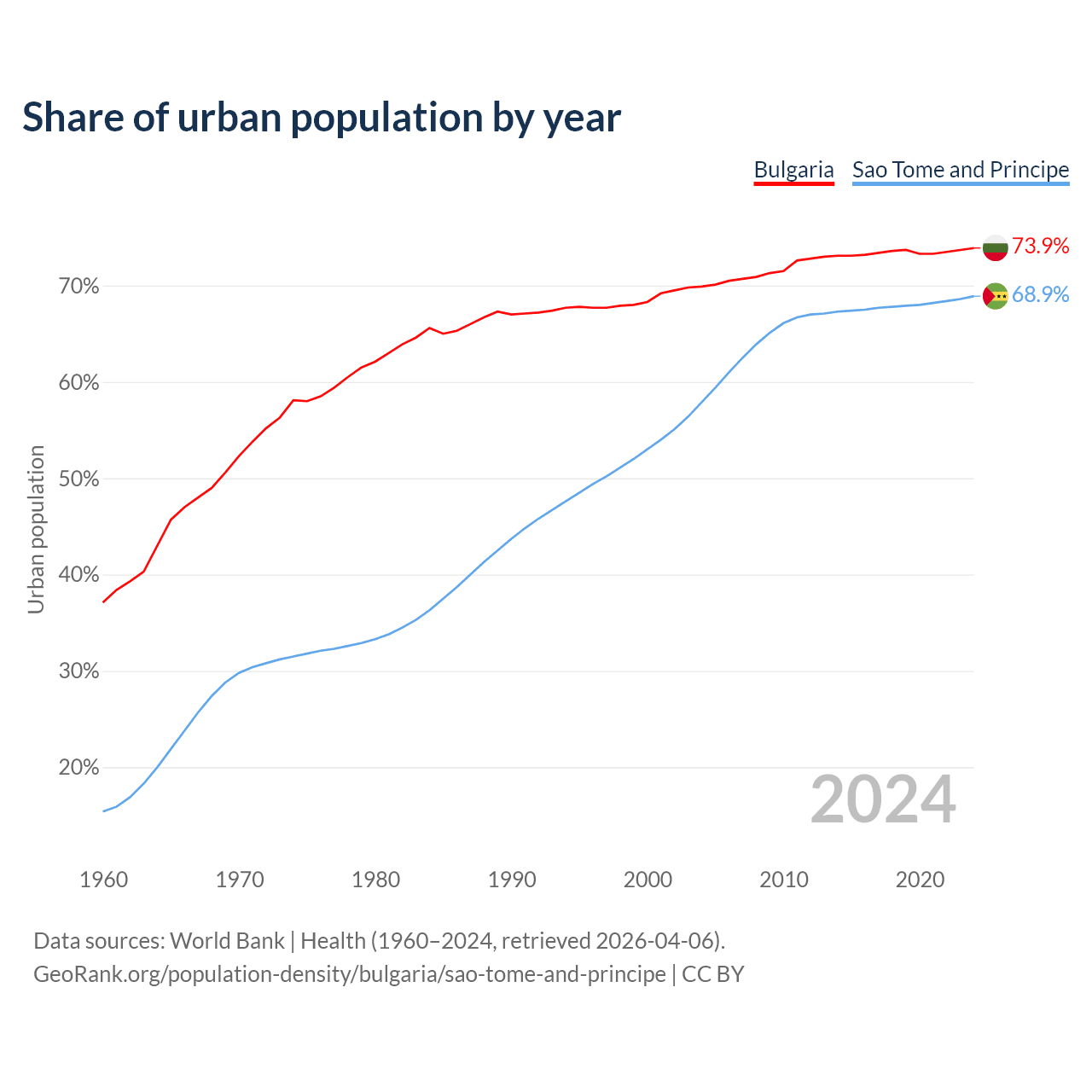 From 2004 to 2024, the share of urban population changed from 69.9% to 73.9% in Bulgaria and from 57.9% to 68.9% in Sao Tome and Principe.