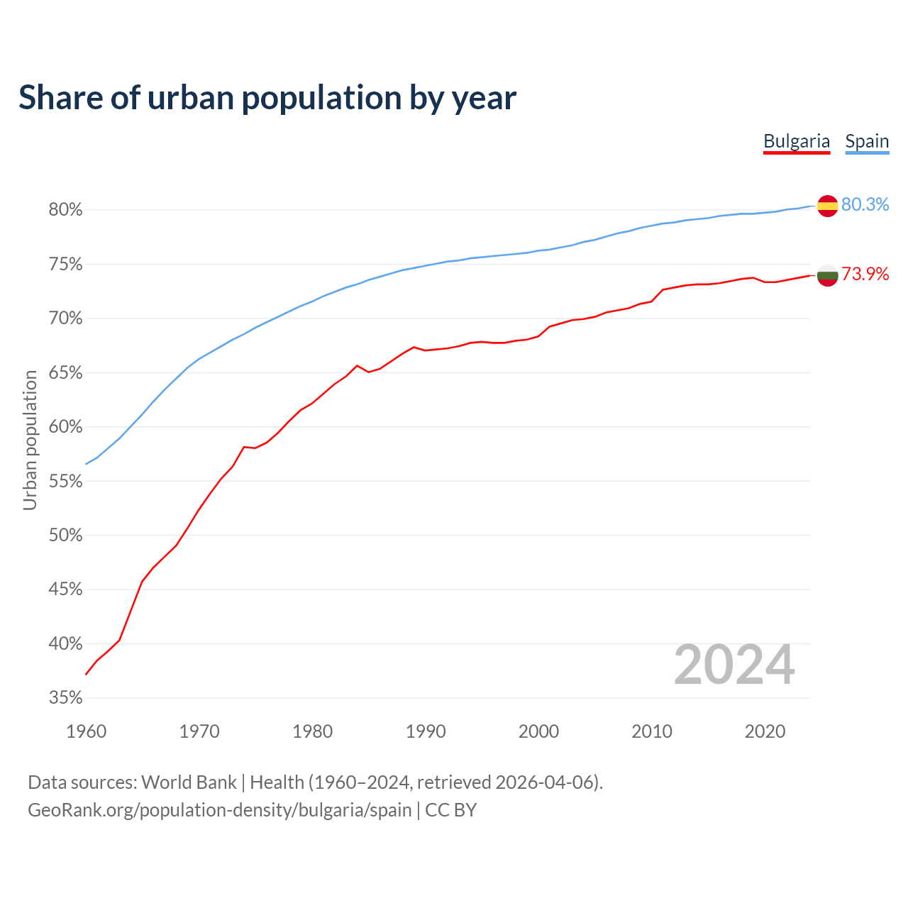 From 2004 to 2024, the share of urban population changed from 69.9% to 73.9% in Bulgaria and from 77% to 80.3% in Spain.