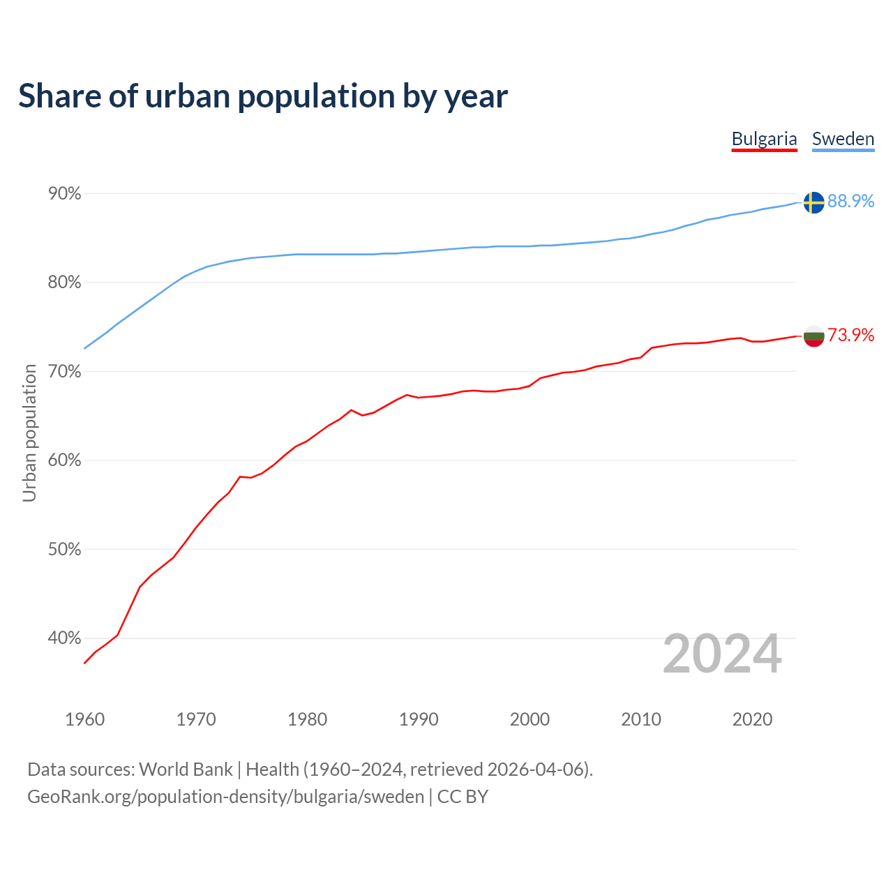 From 2004 to 2024, the share of urban population changed from 69.9% to 73.9% in Bulgaria and from 84.3% to 88.9% in Sweden.