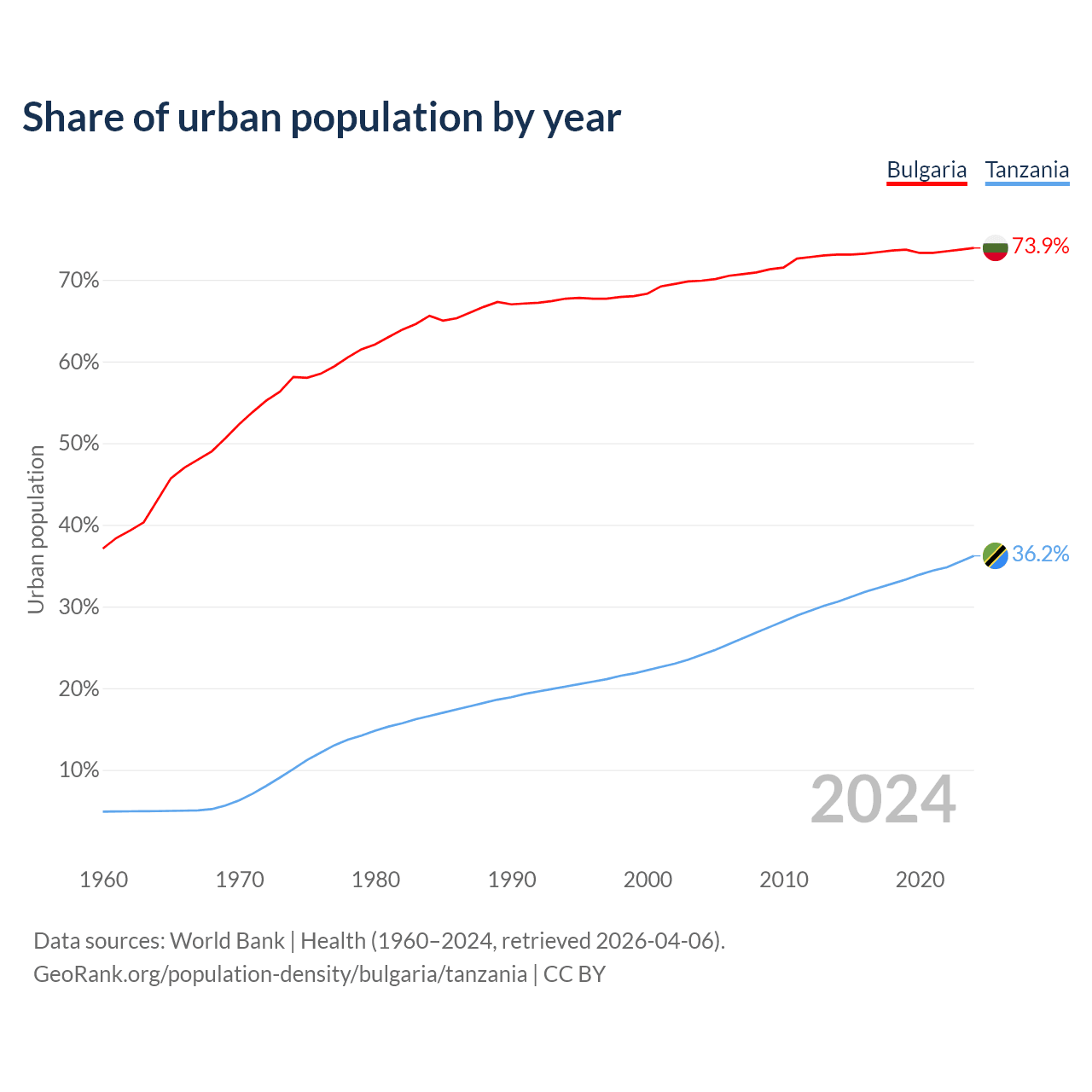 From 2004 to 2024, the share of urban population changed from 69.9% to 73.9% in Bulgaria and from 24.1% to 36.2% in Tanzania.
