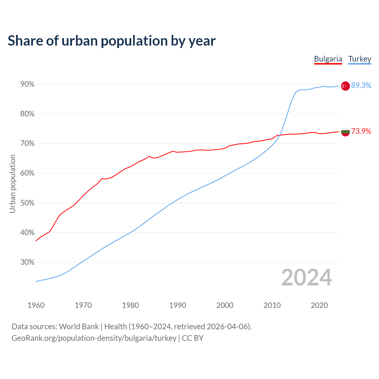 From 2004 to 2024, the share of urban population changed from 69.9% to 73.9% in Bulgaria and from 62.4% to 89.3% in Turkey.