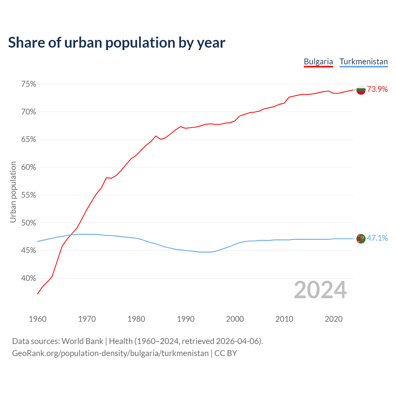 From 2004 to 2024, the share of urban population changed from 69.9% to 73.9% in Bulgaria and from 46.7% to 47.1% in Turkmenistan.