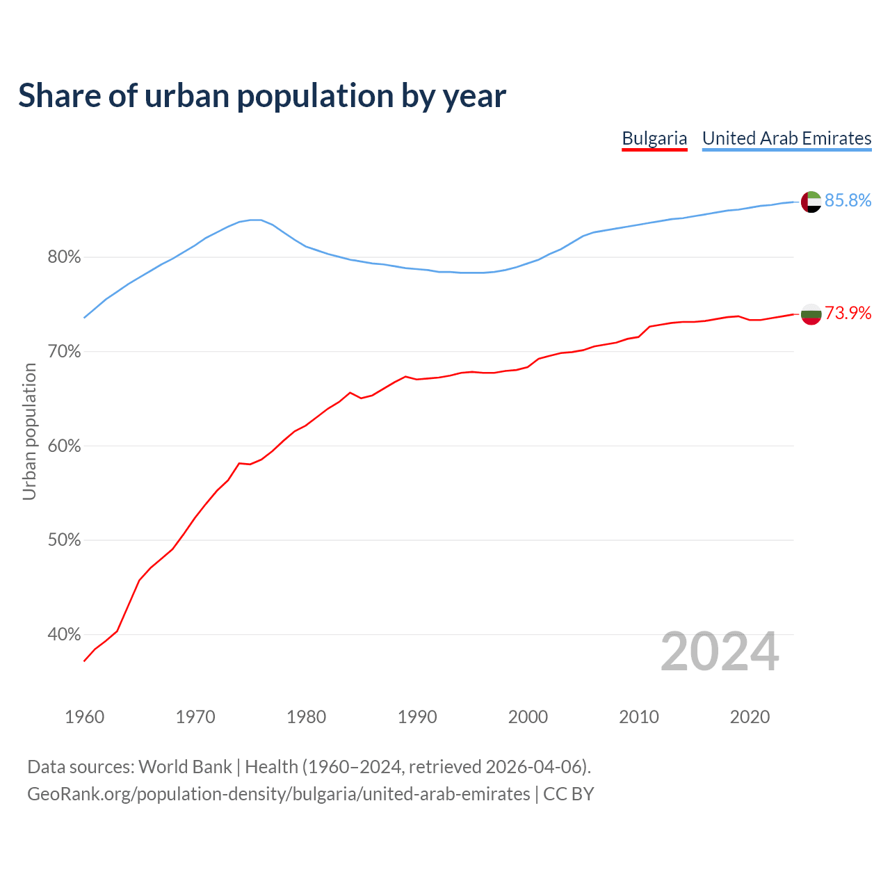 From 2004 to 2024, the share of urban population changed from 69.9% to 73.9% in Bulgaria and from 81.5% to 85.8% in the United Arab Emirates.