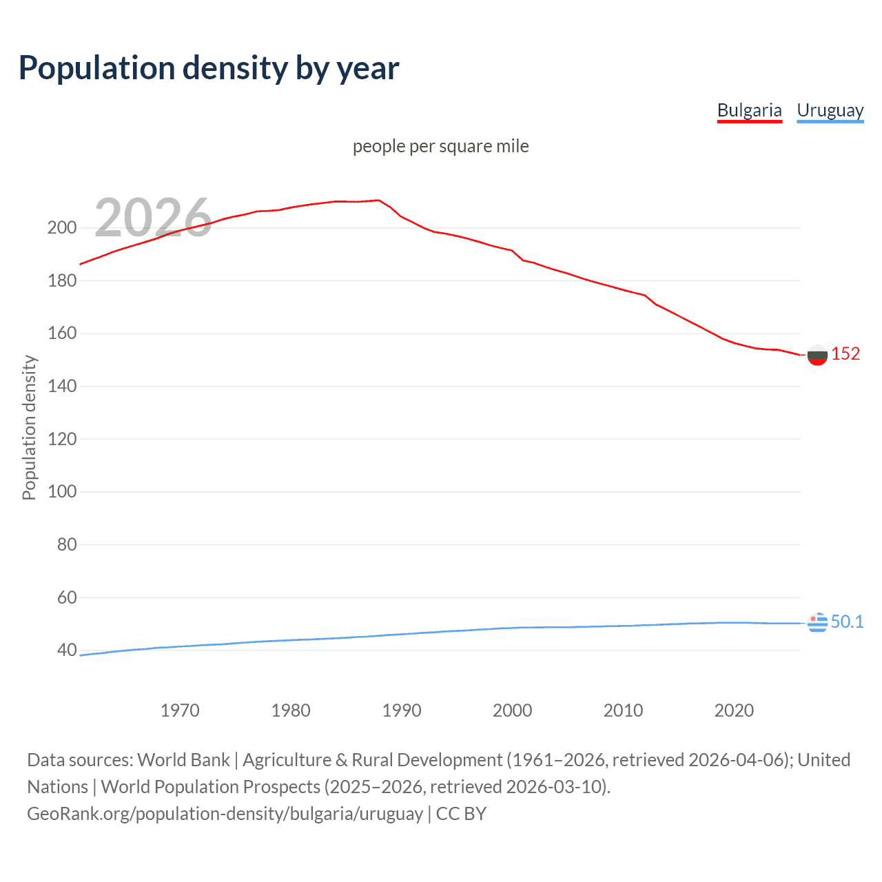 From 2006 to 2026, population density in Bulgaria decreased by 16.3%, compared to a 2.84% growth in Uruguay.
