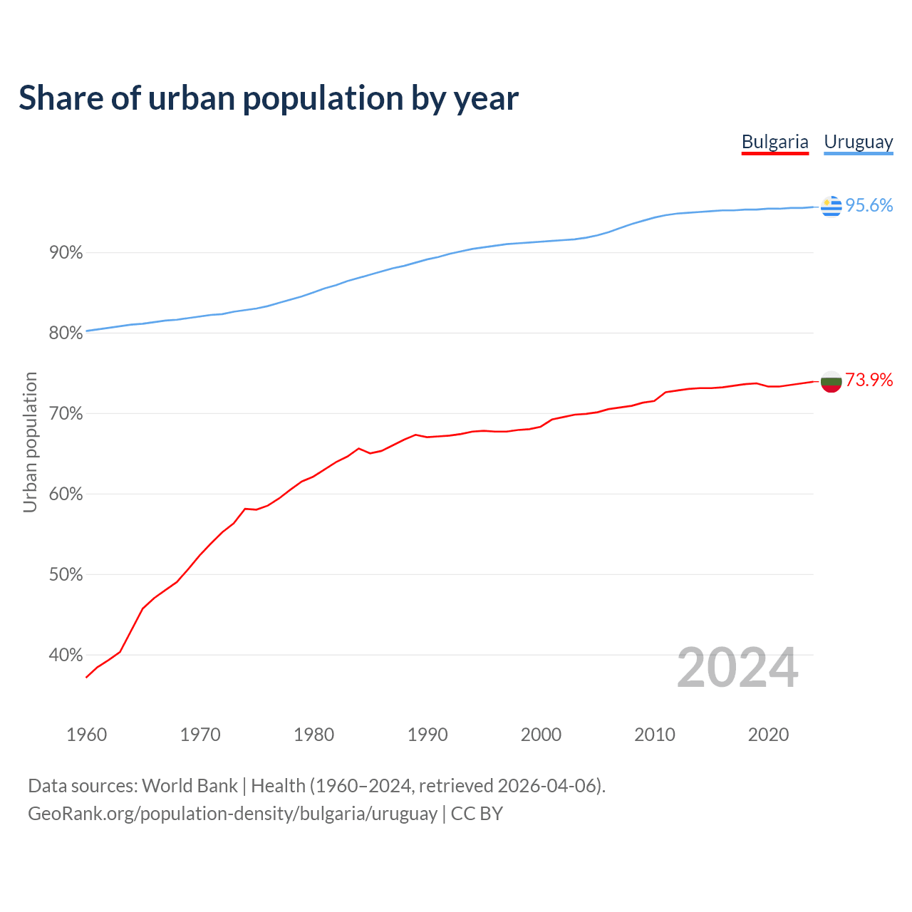 From 2004 to 2024, the share of urban population changed from 69.9% to 73.9% in Bulgaria and from 91.8% to 95.6% in Uruguay.