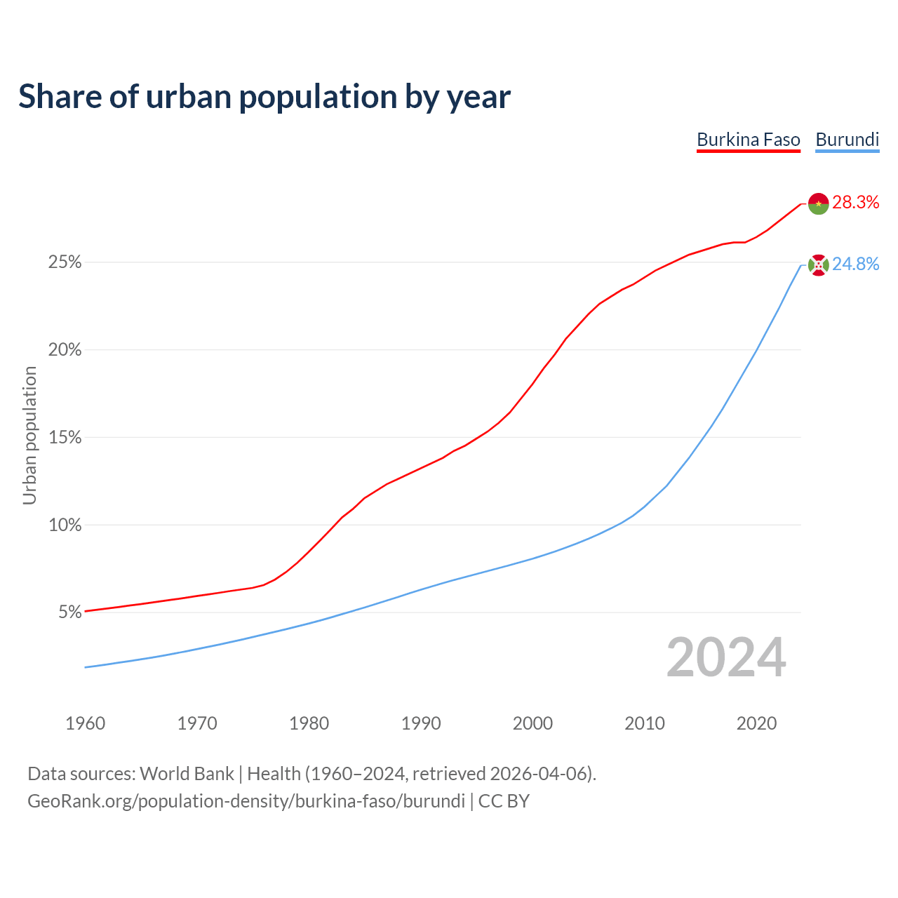 From 2004 to 2024, the share of urban population changed from 21.3% to 28.3% in Burkina Faso and from 8.92% to 24.8% in Burundi.