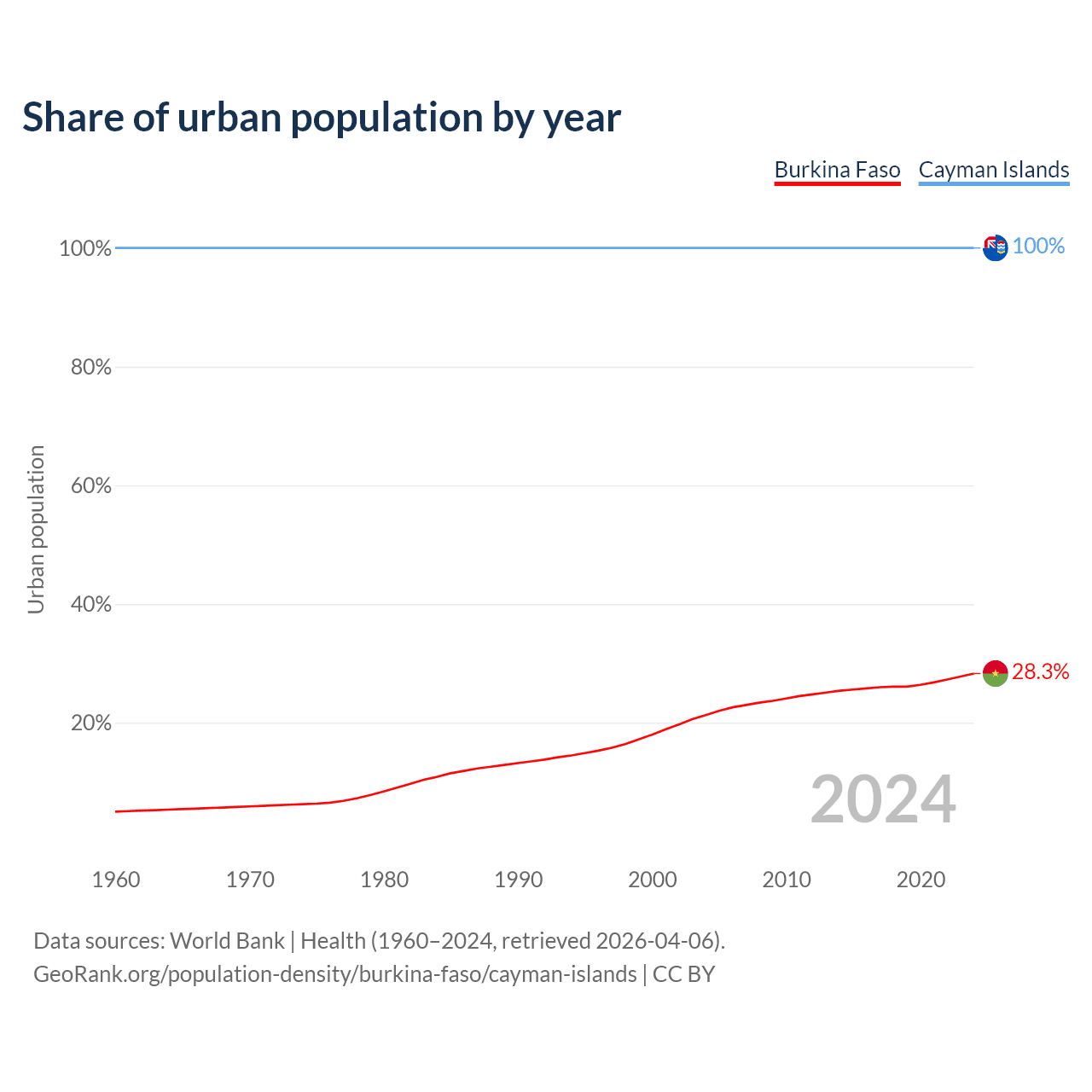 From 2004 to 2024, the share of urban population changed from 21.3% to 28.3% in Burkina Faso and from 100% to 100% in the Cayman Islands.
