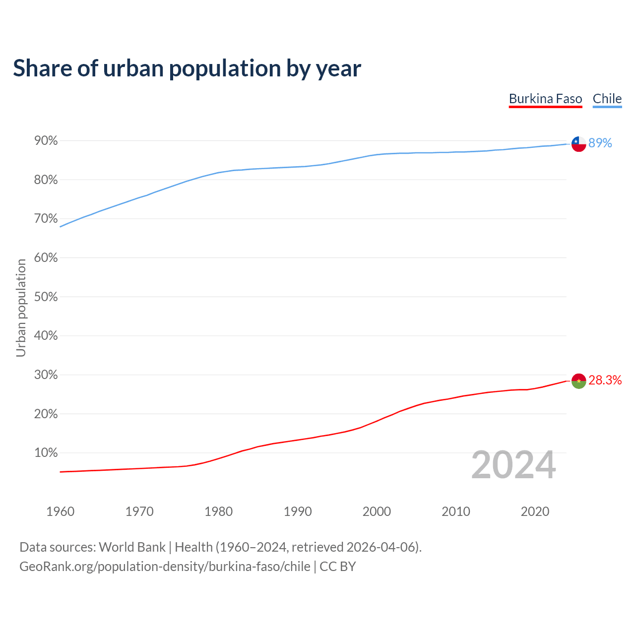 From 2004 to 2024, the share of urban population changed from 21.3% to 28.3% in Burkina Faso and from 86.7% to 89% in Chile.