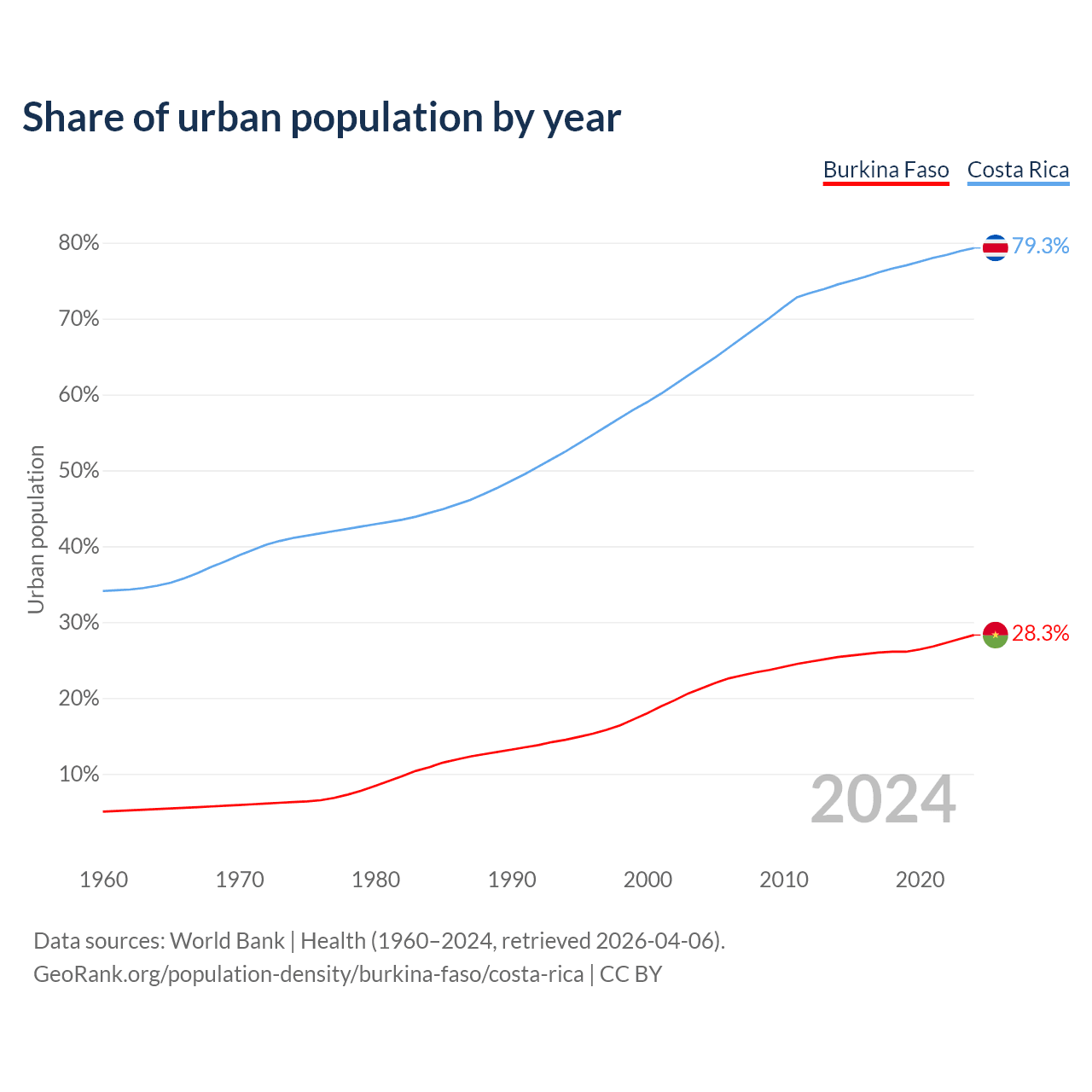 From 2004 to 2024, the share of urban population changed from 21.3% to 28.3% in Burkina Faso and from 63.7% to 79.3% in Costa Rica.