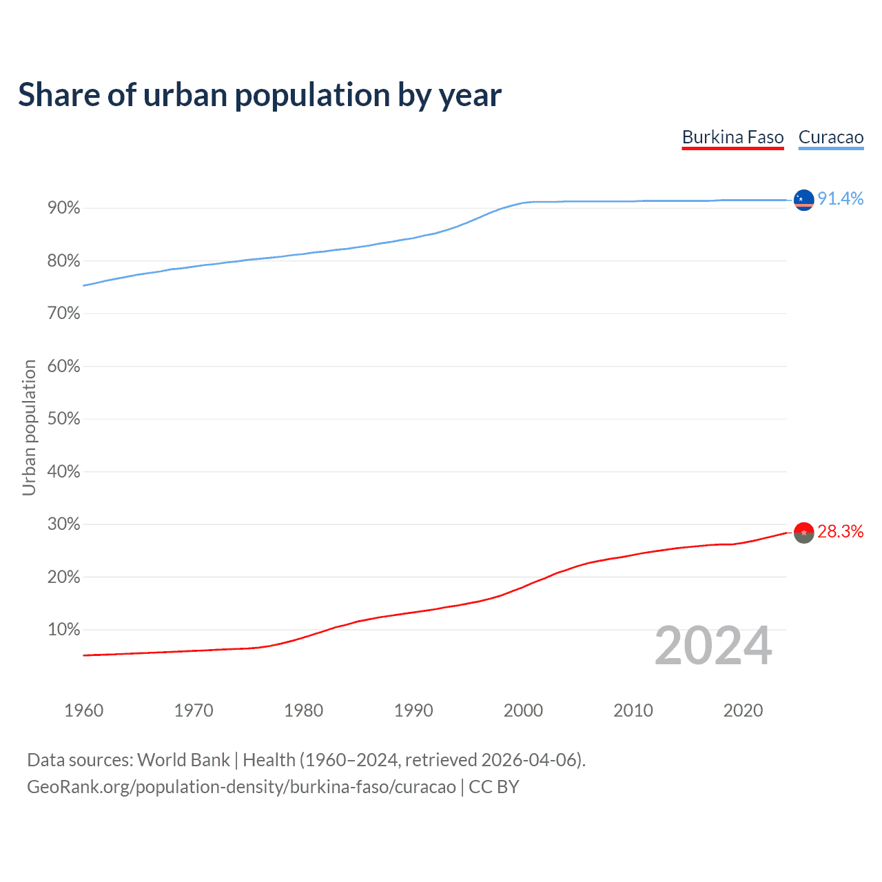 From 2004 to 2024, the share of urban population changed from 21.3% to 28.3% in Burkina Faso and from 91.2% to 91.4% in Curacao.