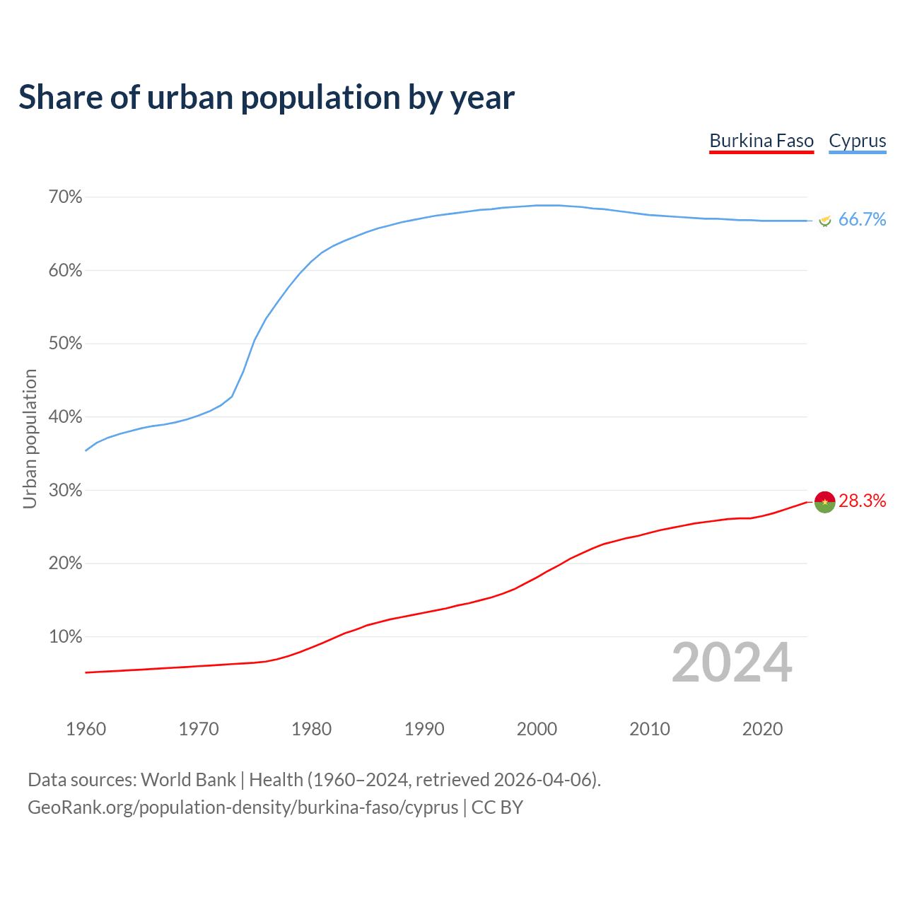 From 2006 to 2026, population density in Burkina Faso increased by 71.2%, compared to a 31.2% growth in Cyprus.