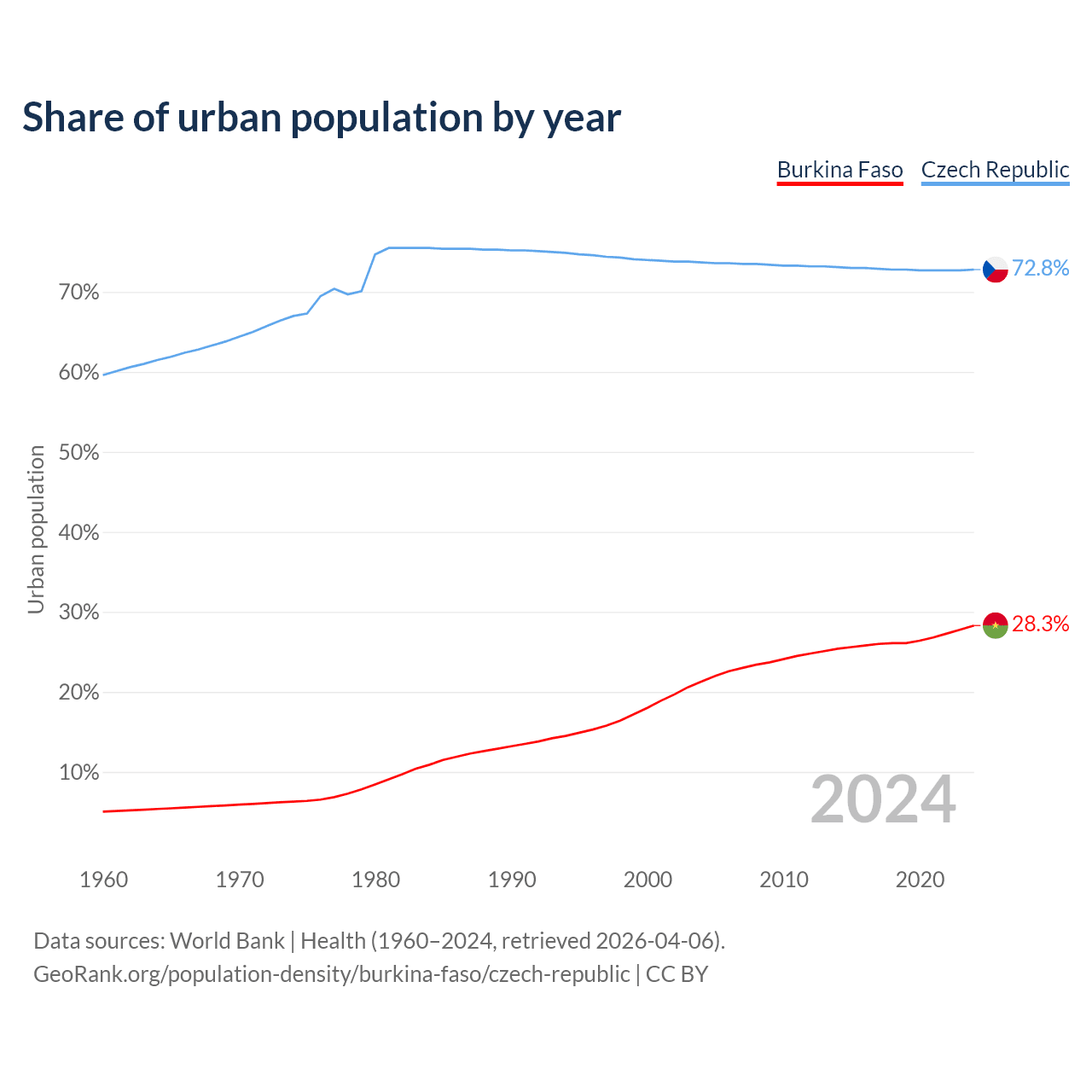 From 2004 to 2024, the share of urban population changed from 21.3% to 28.3% in Burkina Faso and from 73.7% to 72.8% in the Czech Republic.