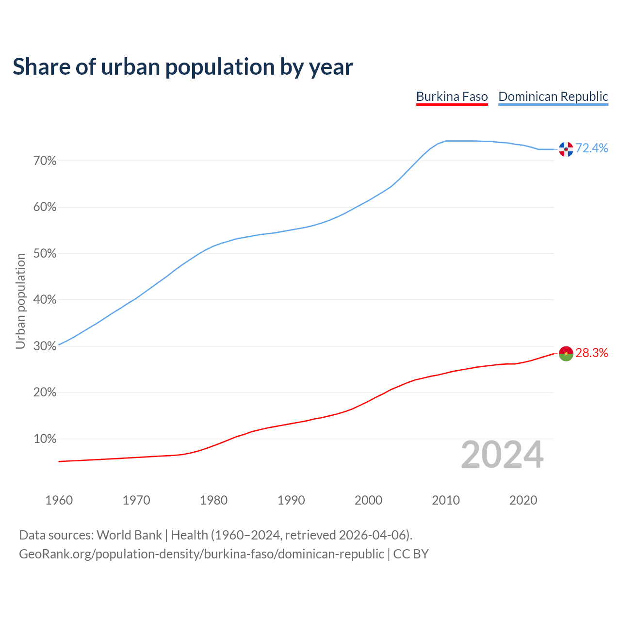 From 2004 to 2024, the share of urban population changed from 21.3% to 28.3% in Burkina Faso and from 65.9% to 72.4% in the Dominican Republic.