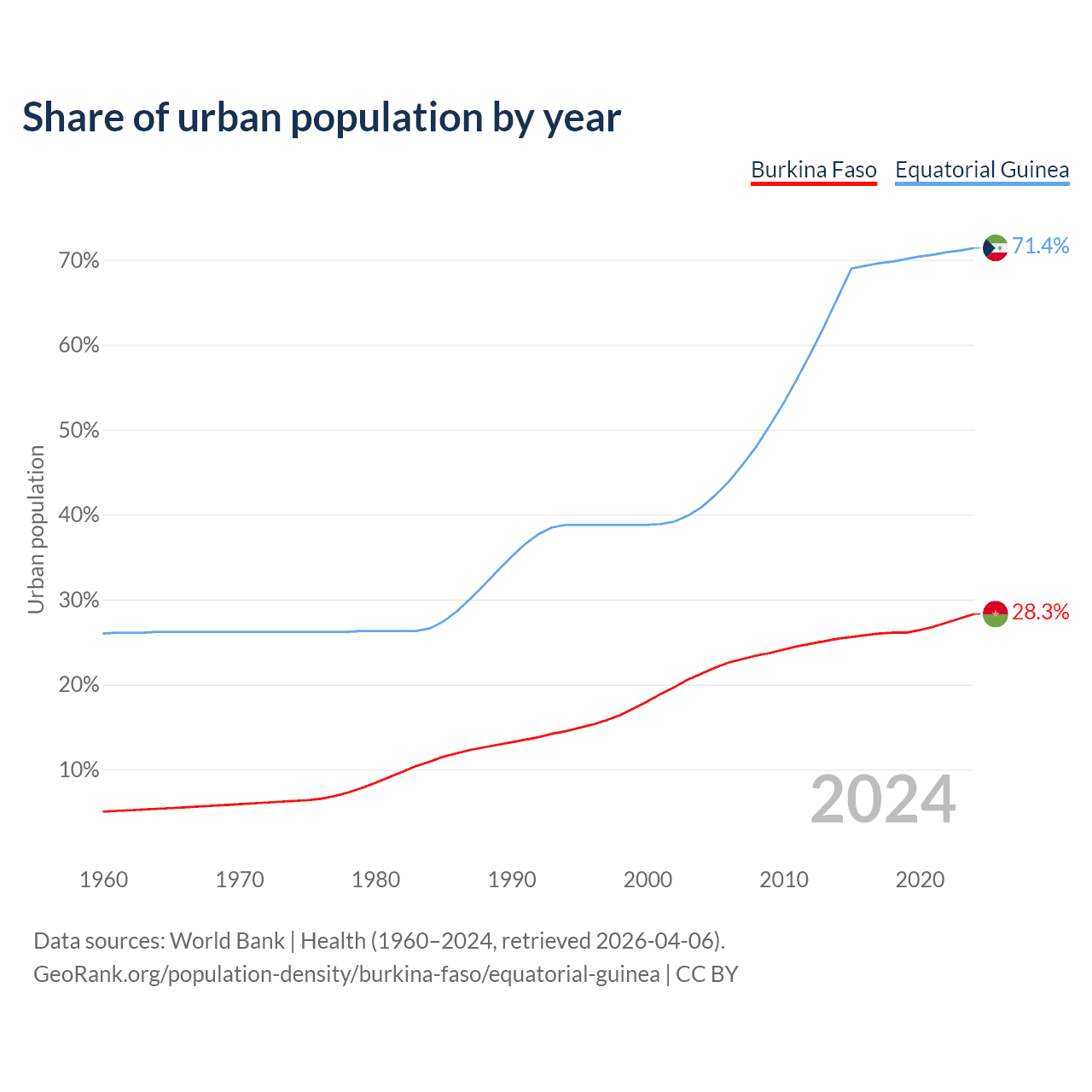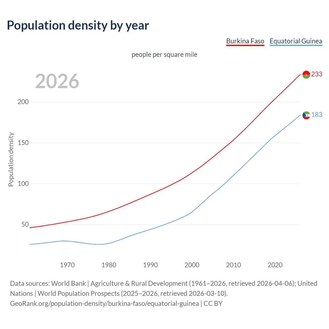 From 2006 to 2026, population density in Burkina Faso increased by 71.2%, compared to a 100.5% growth in Equatorial Guinea.