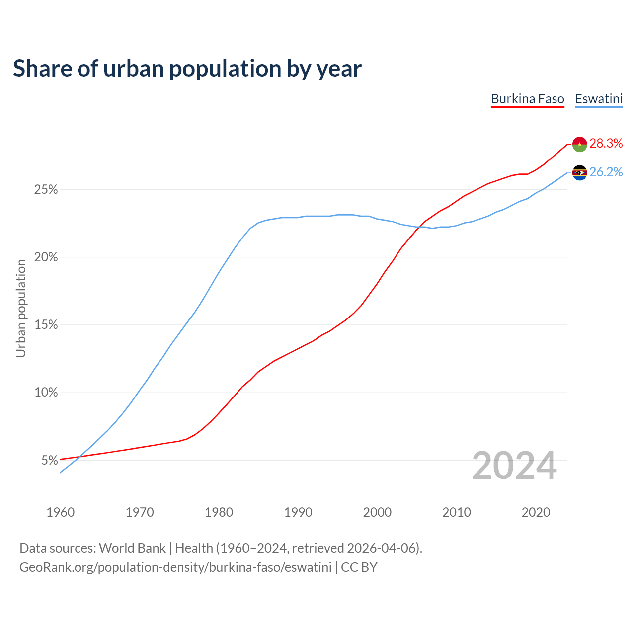 From 2004 to 2024, the share of urban population changed from 21.3% to 28.3% in Burkina Faso and from 22.3% to 26.2% in Eswatini.