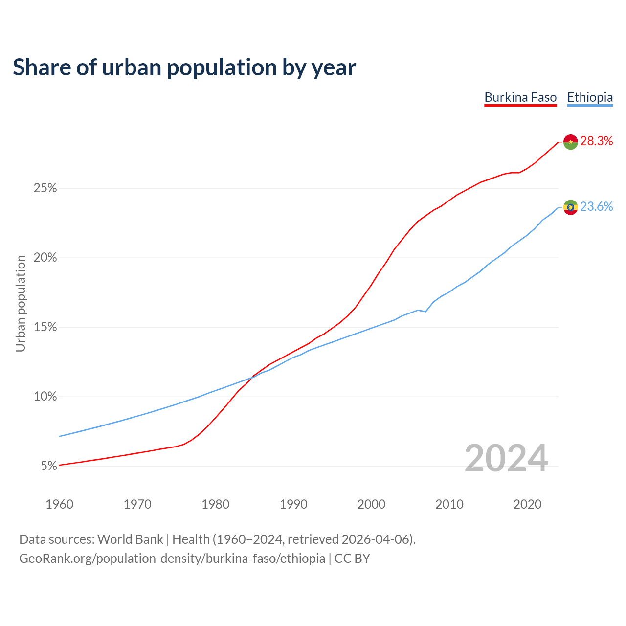 From 2004 to 2024, the share of urban population changed from 21.3% to 28.3% in Burkina Faso and from 15.8% to 23.6% in Ethiopia.