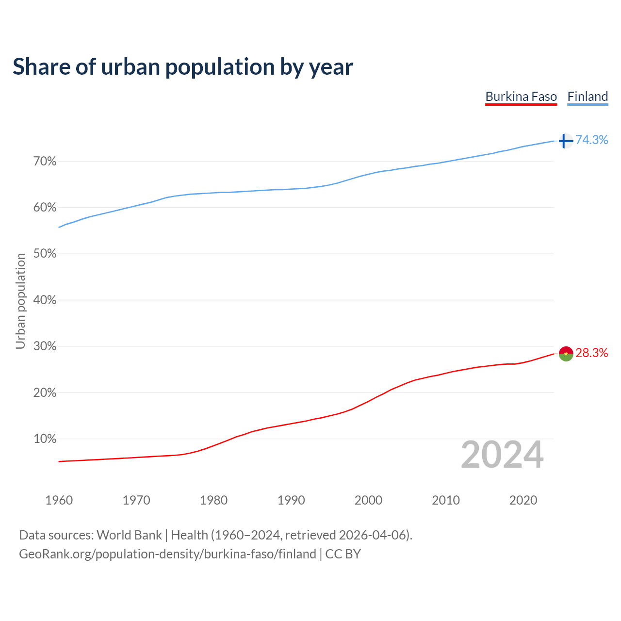 From 2006 to 2026, population density in Burkina Faso increased by 71.2%, compared to a 7% growth in Finland.