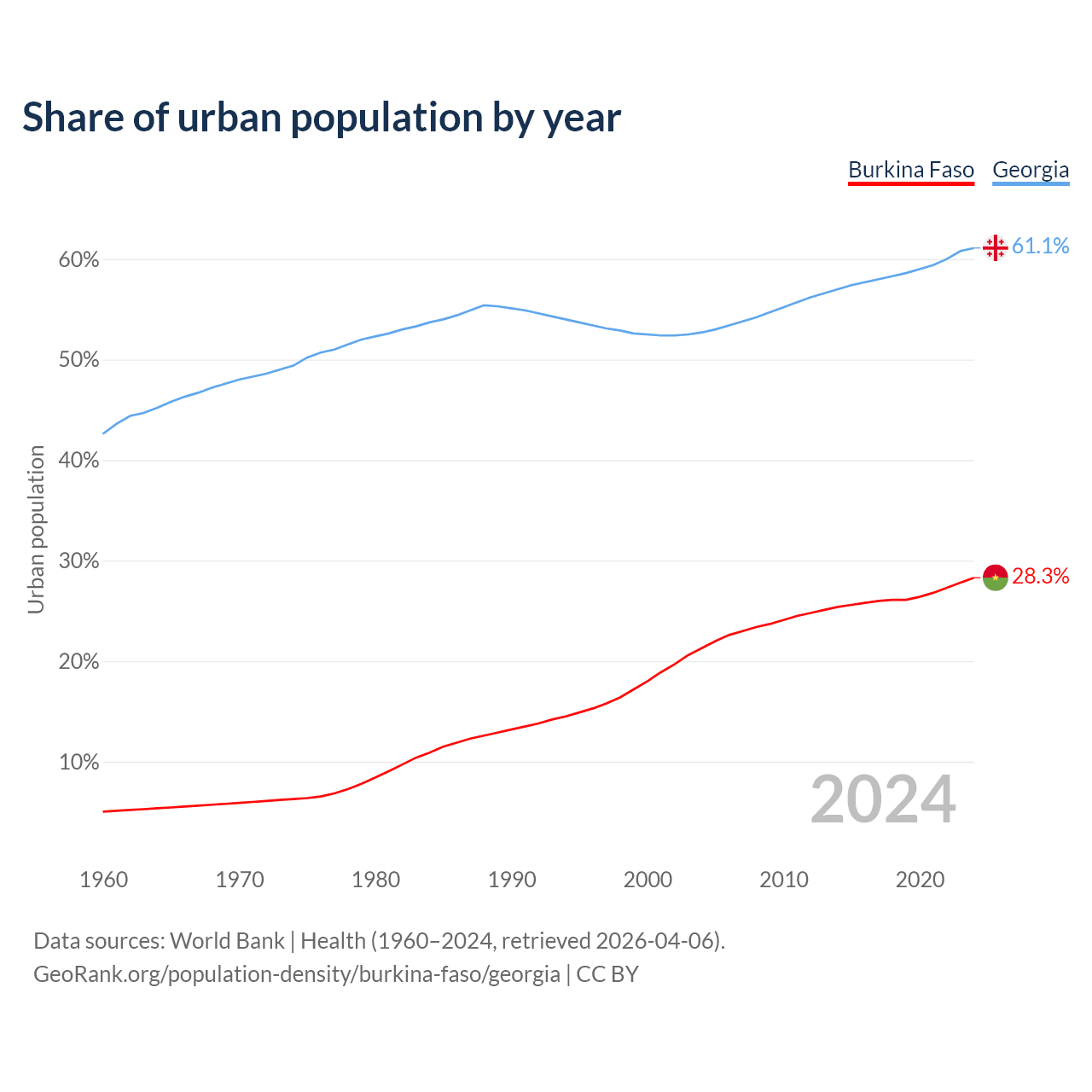 From 2006 to 2026, population density in Burkina Faso increased by 71.2%, compared to a 4.71% decline in Georgia.