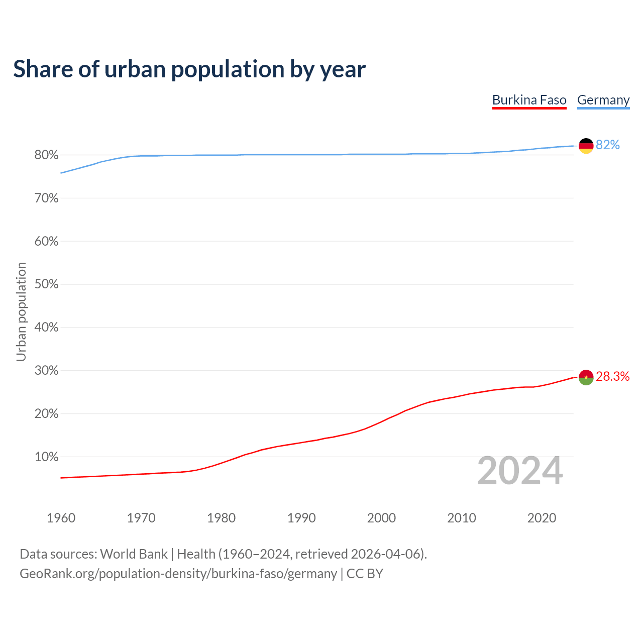 From 2004 to 2024, the share of urban population changed from 21.3% to 28.3% in Burkina Faso and from 80.2% to 82% in Germany.