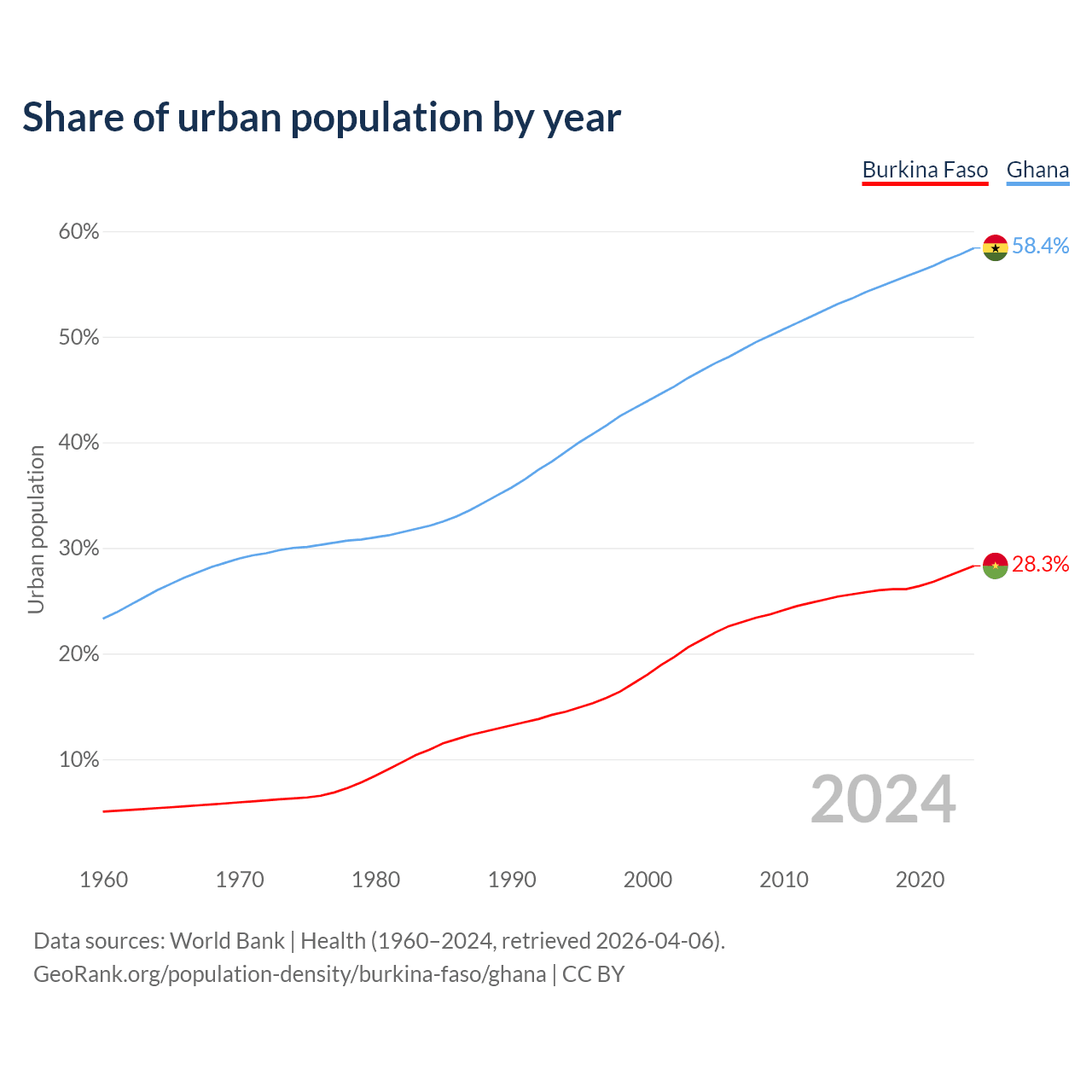 From 2004 to 2024, the share of urban population changed from 21.3% to 28.3% in Burkina Faso and from 46.8% to 58.4% in Ghana.