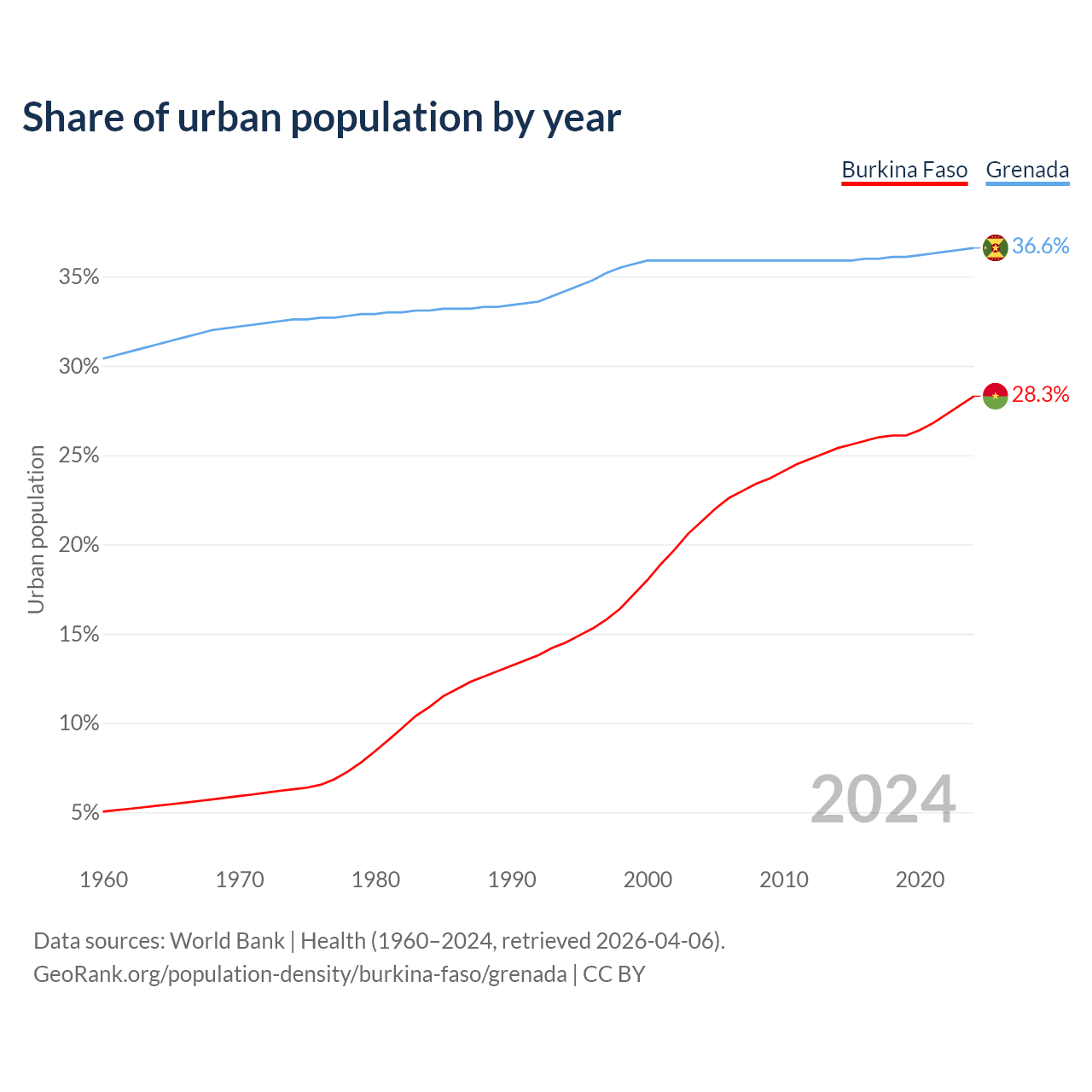 From 2004 to 2024, the share of urban population changed from 21.3% to 28.3% in Burkina Faso and from 35.9% to 36.6% in Grenada.