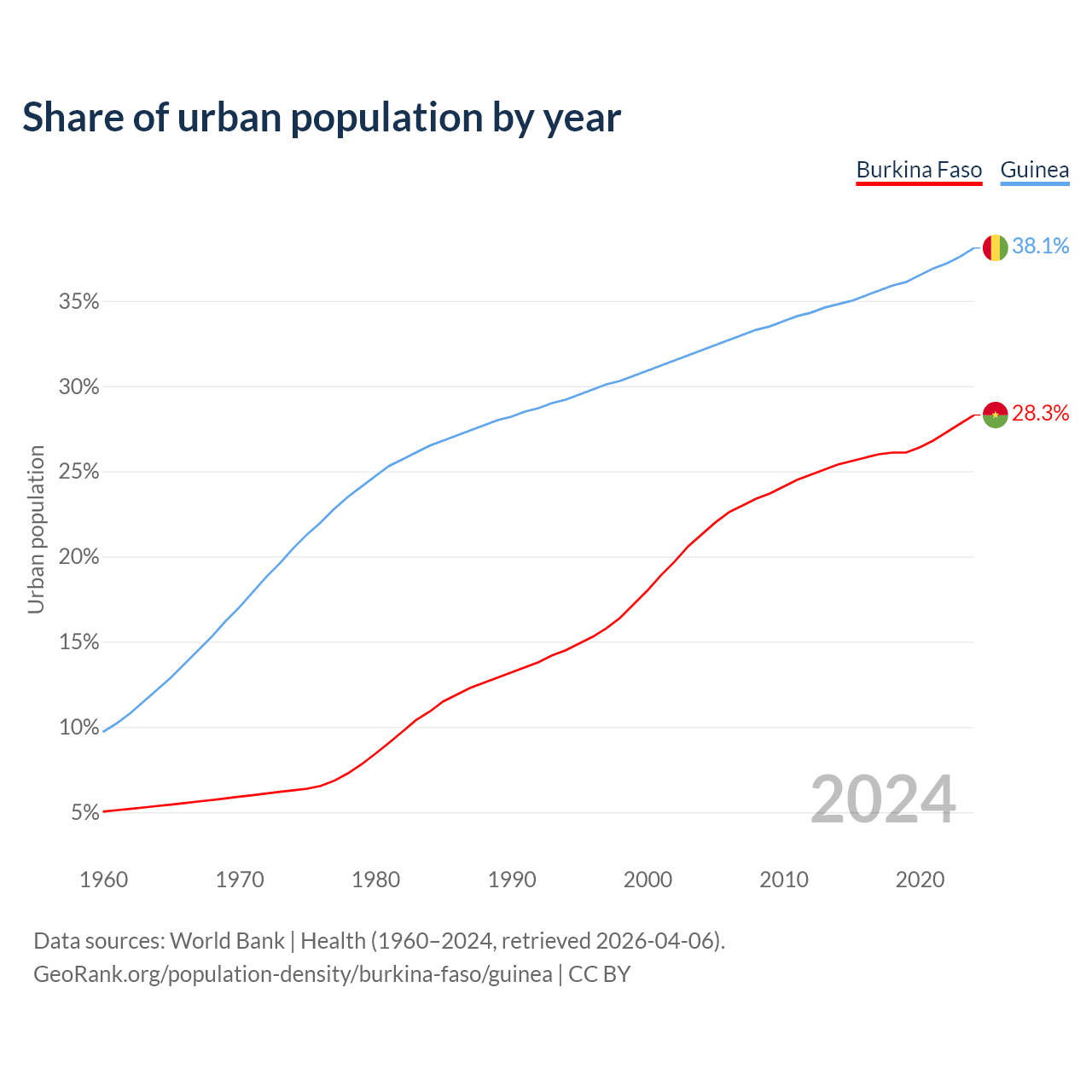 From 2004 to 2024, the share of urban population changed from 21.3% to 28.3% in Burkina Faso and from 32.1% to 38.1% in Guinea.