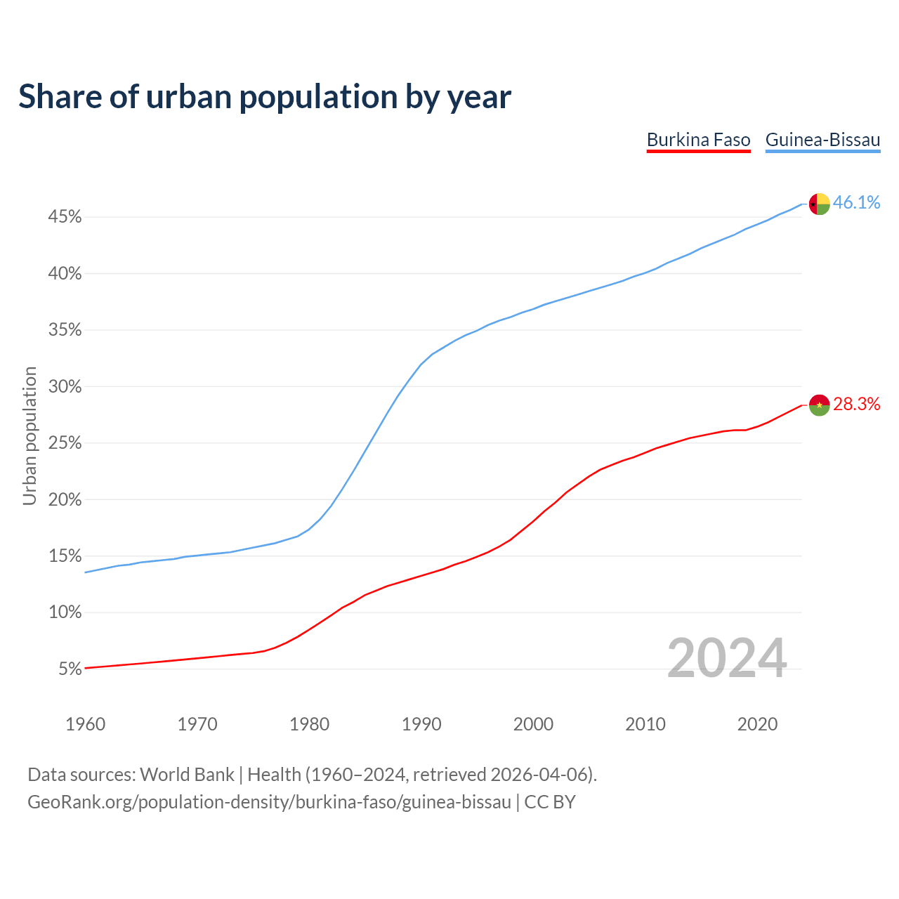 From 2004 to 2024, the share of urban population changed from 21.3% to 28.3% in Burkina Faso and from 38.1% to 46.1% in Guinea-Bissau.
