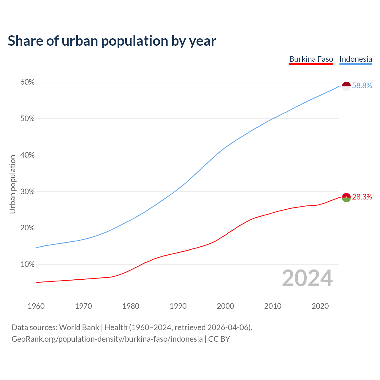 From 2004 to 2024, the share of urban population changed from 21.3% to 28.3% in Burkina Faso and from 45.4% to 58.8% in Indonesia.