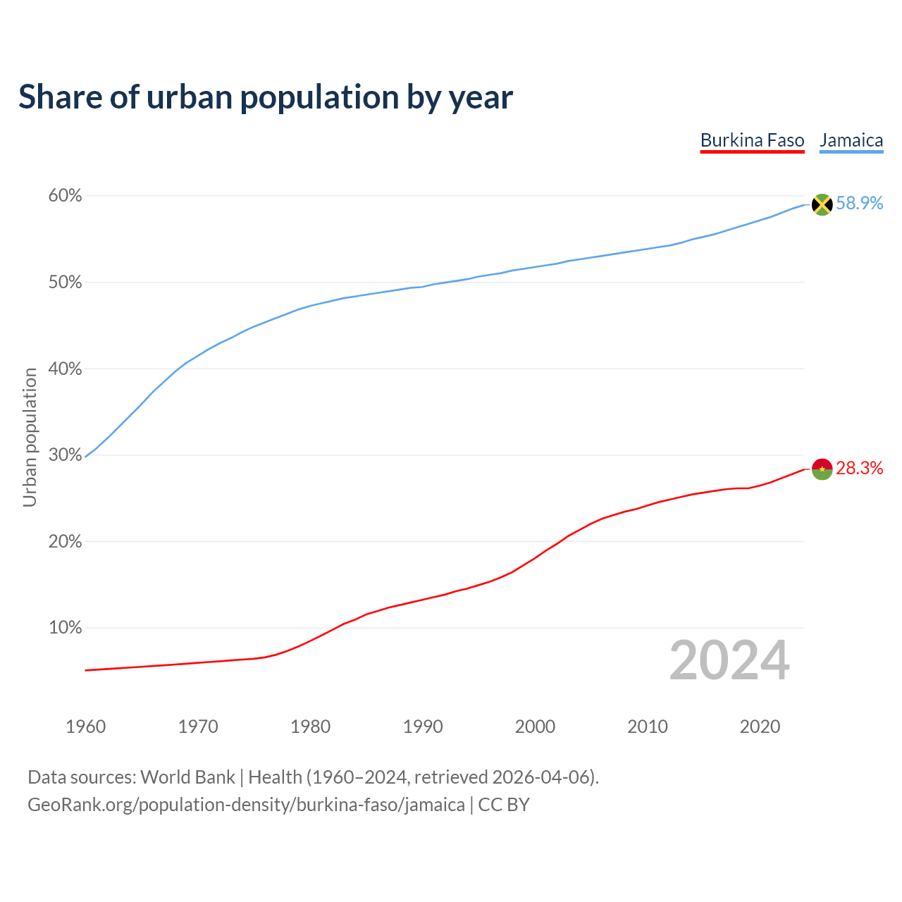 From 2004 to 2024, the share of urban population changed from 21.3% to 28.3% in Burkina Faso and from 52.6% to 58.9% in Jamaica.