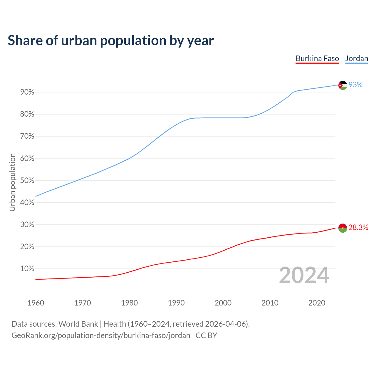 From 2006 to 2026, population density in Burkina Faso increased by 71.2%, compared to a 77.6% growth in Jordan.